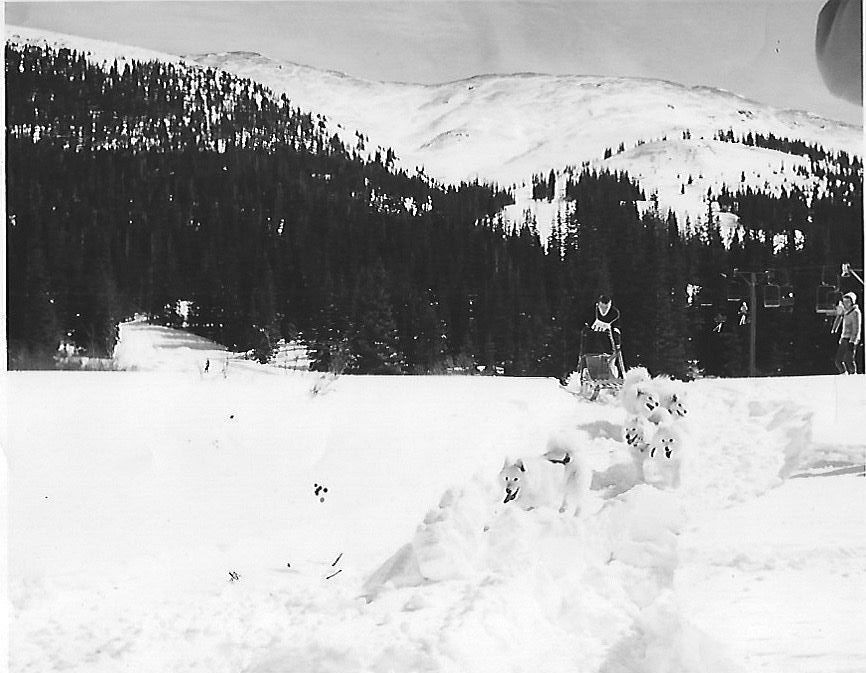 Merle Mays with 5-dog Samoyed team at race at Colorado ski area