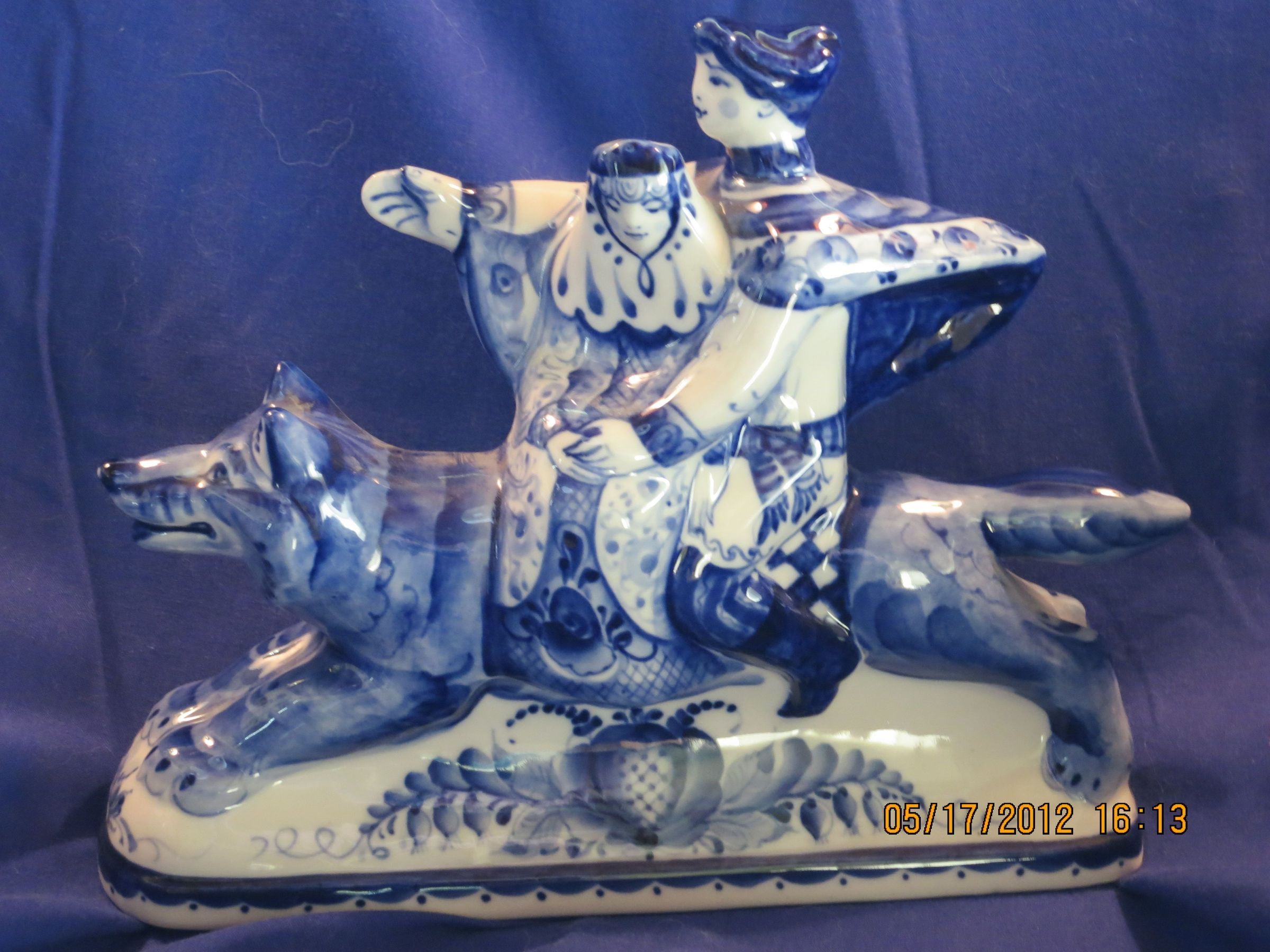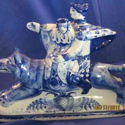 Ceramic-Old World Couple Escaping or Riding on a Dog