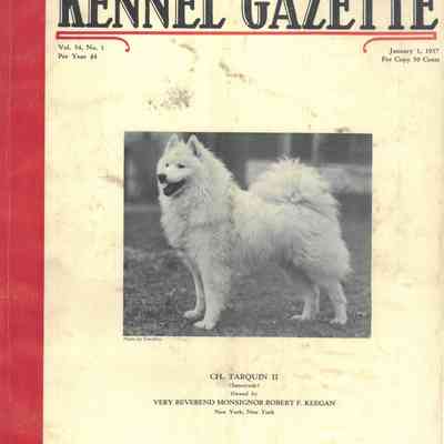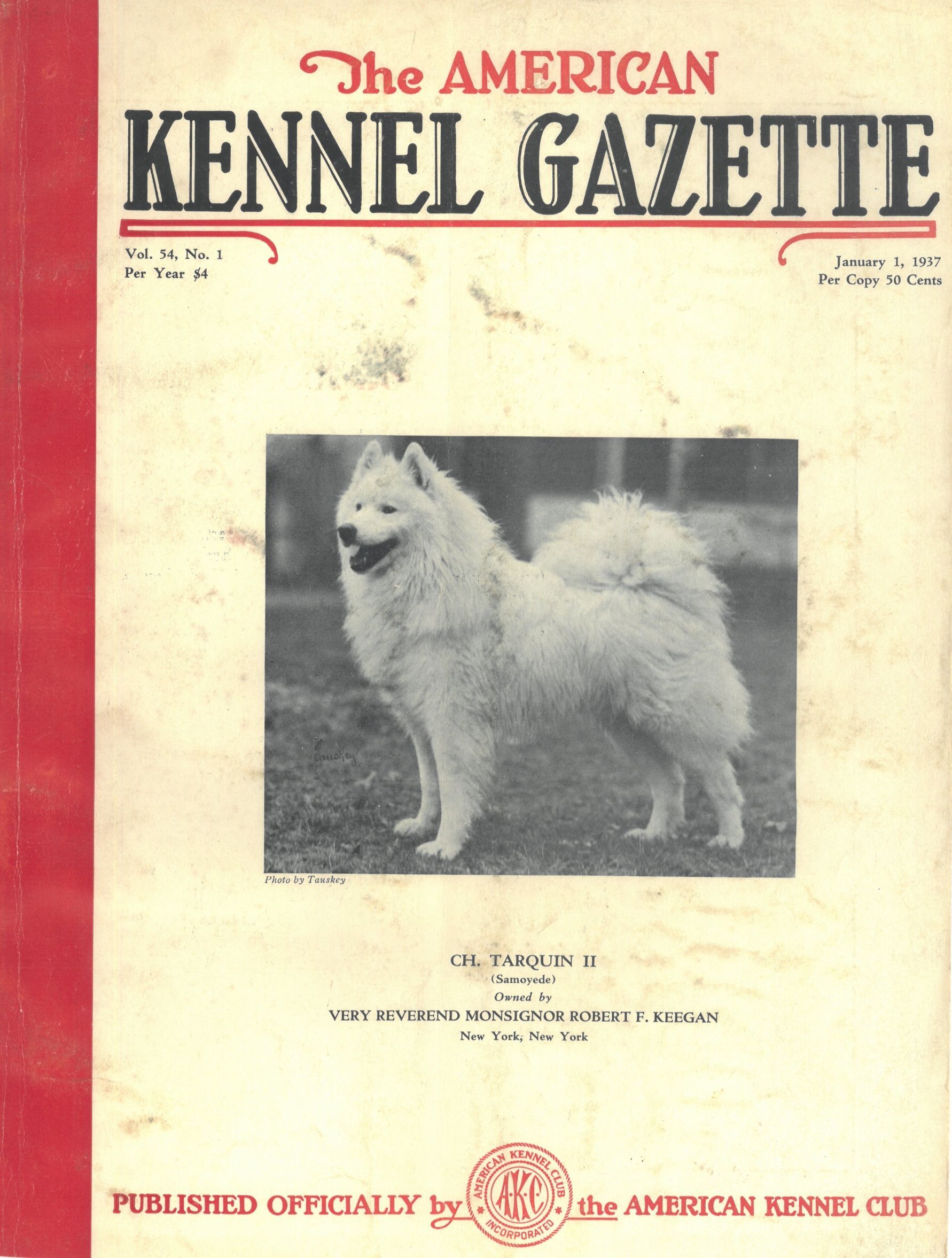 Kistner Book-AKC Gazette Cover January 1, 1937, Ch. Tarquin II (Samoyede) Owned by Very Rev Monsignor Robert F. Keegan, New York, Credit: AKC Gazette, January 1, 1937, AKC Library & ArchivesTags