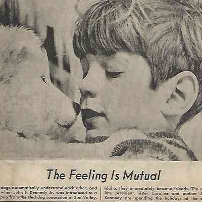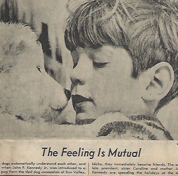 Picture of John-John Kennedy with Samoyed puppy at Sun Valley ski area, Idaho