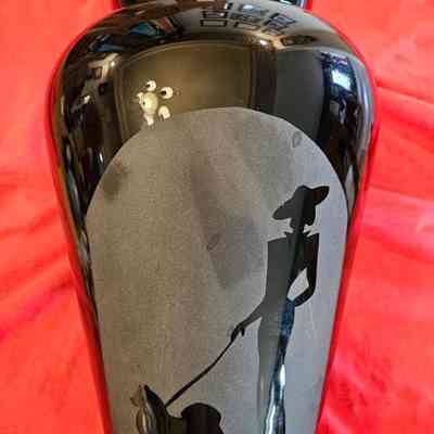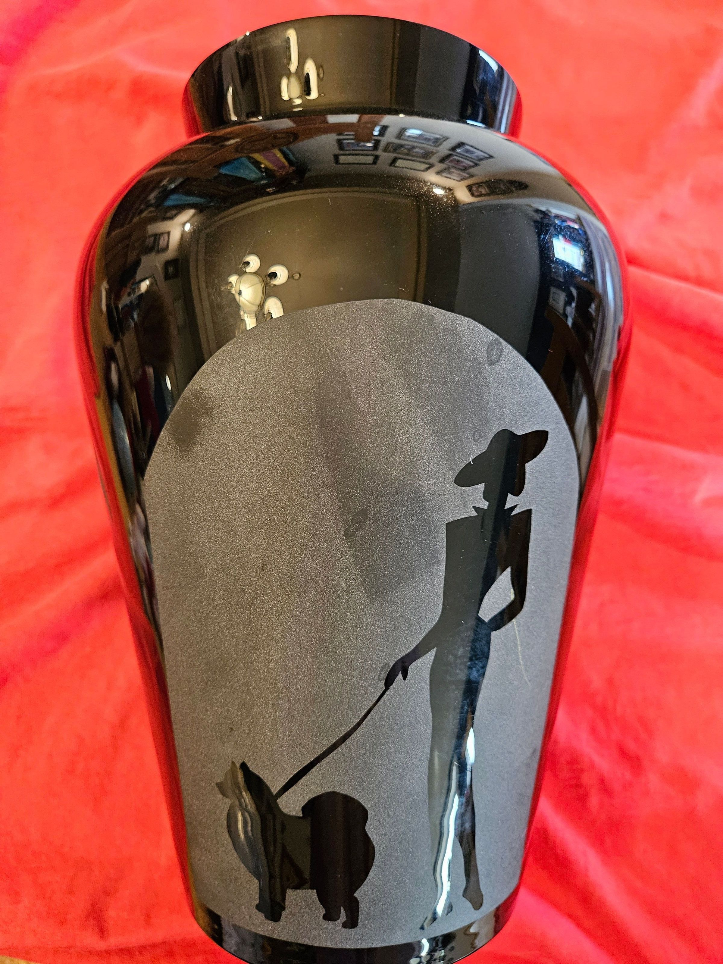 Vase-Black Milk Glass with Acid Etched Woman and Samoyed (Circa 1920-1932)