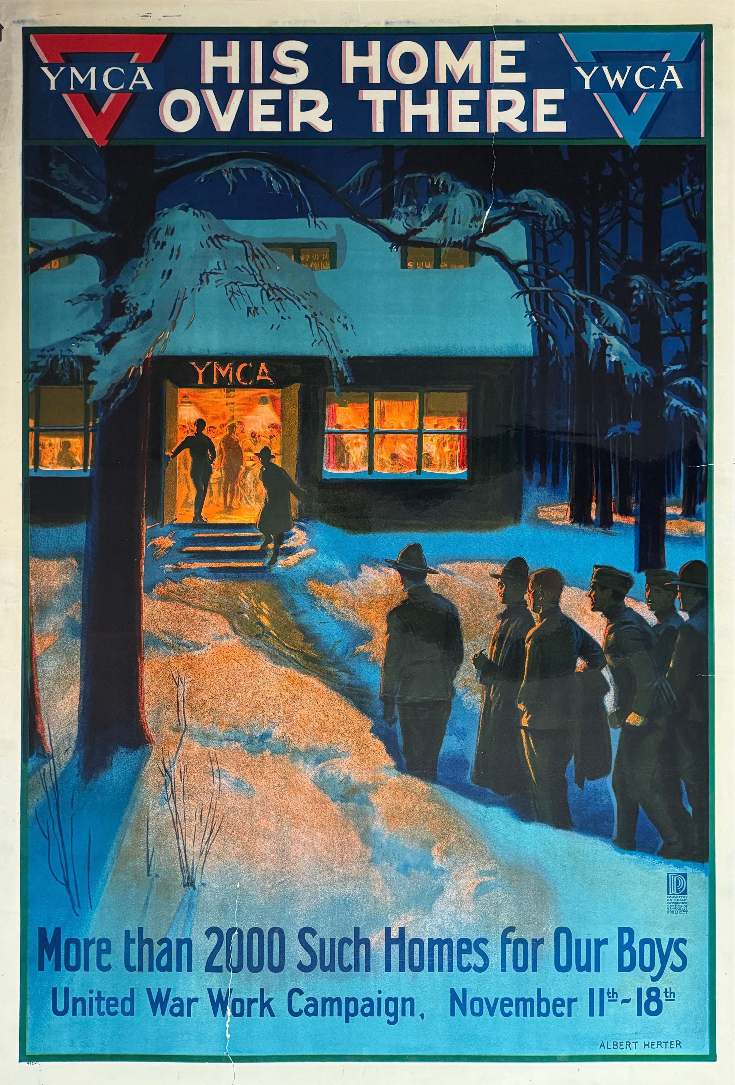 Poster with the words "His Home Over There" at the top, featuring a snowy scene where silhouetted soldiers walk towards a warmly lit building labeled "YMCA," with bright light emanating from inside through the windows and doorway; below, the text promotes the United War Work Campaign from November 11th to 18th, emphasizing that there are over 2000 similar homes for soldiers, providing warmth and comfort during the war, highlighting the collaboration of YMCA and YWCA.