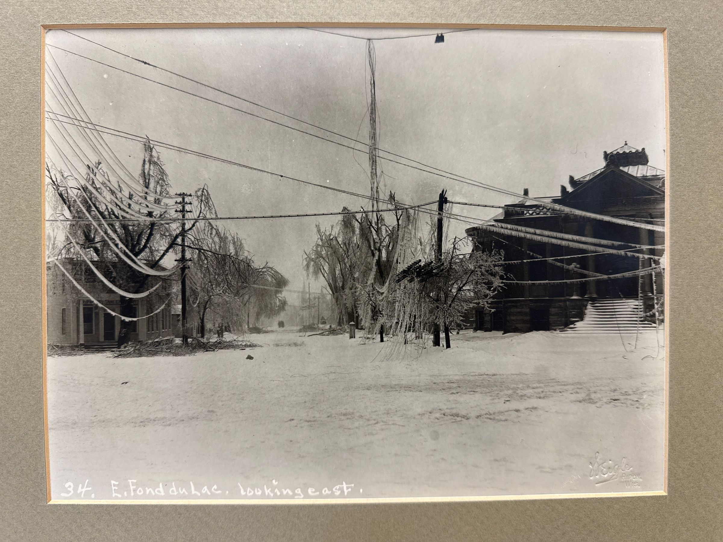 1922 ice storm photo intersection of Watson and East Fond du Lac looking east on FDL. Ripon Steam Laundry visible on left. Library (401 Watson) on right. Black & white photo measures