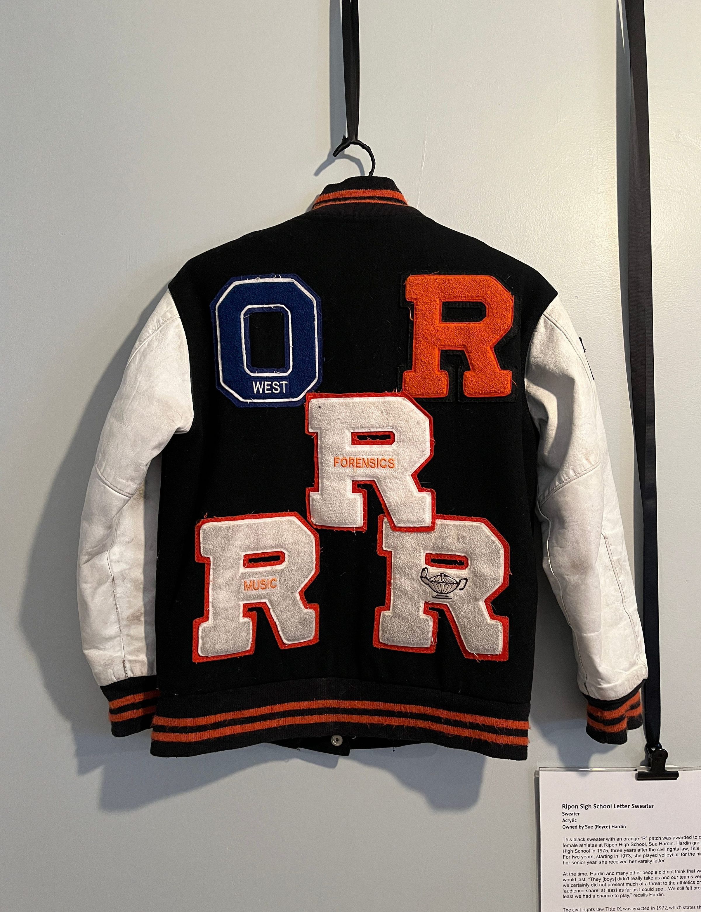 This Letterman Jacket, with the various varsity letters, was awarded to 2019 Ripon High School Graduate Lili Alderson. The Blue O is from her freshman year, first semester, at Oshkosh West where she was a varsity athlete for wrestling. She transferred to Ripon High School in the second semester and went on to letter in cross country, wrestling, and soccer. Not only was she heavily involved in sports, but she participated in band and the forensics team while at Ripon. She also received an academic letter for excelling, academically, her junior year. Today she is a Ripon College student who continues to participate in sports. Currently she is on the Cross Country and Track and Field team.