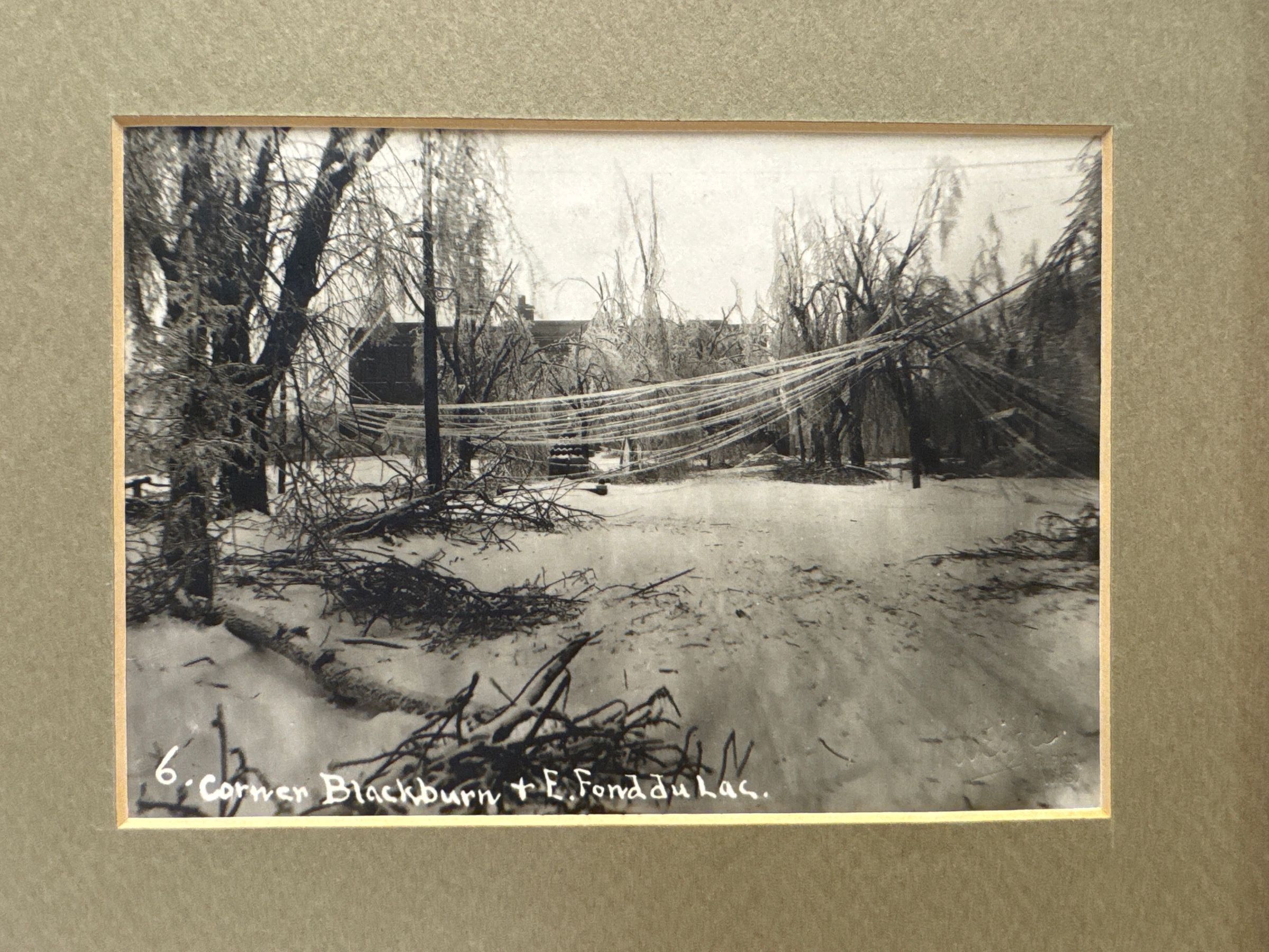 1922 ice storm photo at corner of Blackburn and East Fond du Lac. High school (Central Park Apts. in 2025) visible in background. See also 2006.0429 Storms Folder in Vertical File A for additional photographs.