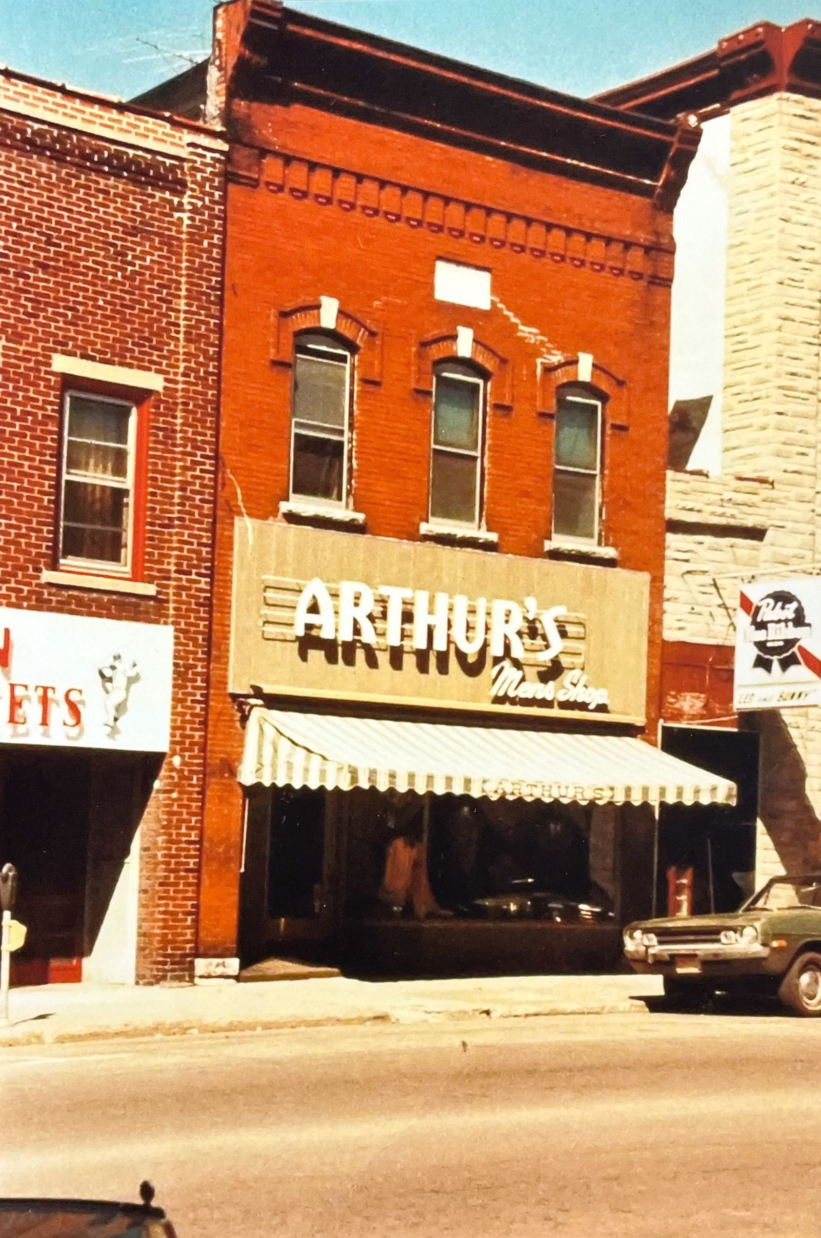 8x12 color photograph of 308 Watson Street showing Arthur's Mens Shop as the business. Date of photo mid-1970s based on portion of next door business Ripon Awards Jackets next door. Date stone toward roofline, which is not legible in photo, reads Bailey 1904. John Wesley Bailey (1840-1920) owned several properties in the Ripon area. See Pedrick Notebooks. Red brick building is similar to others in the commercial district built during this time period.