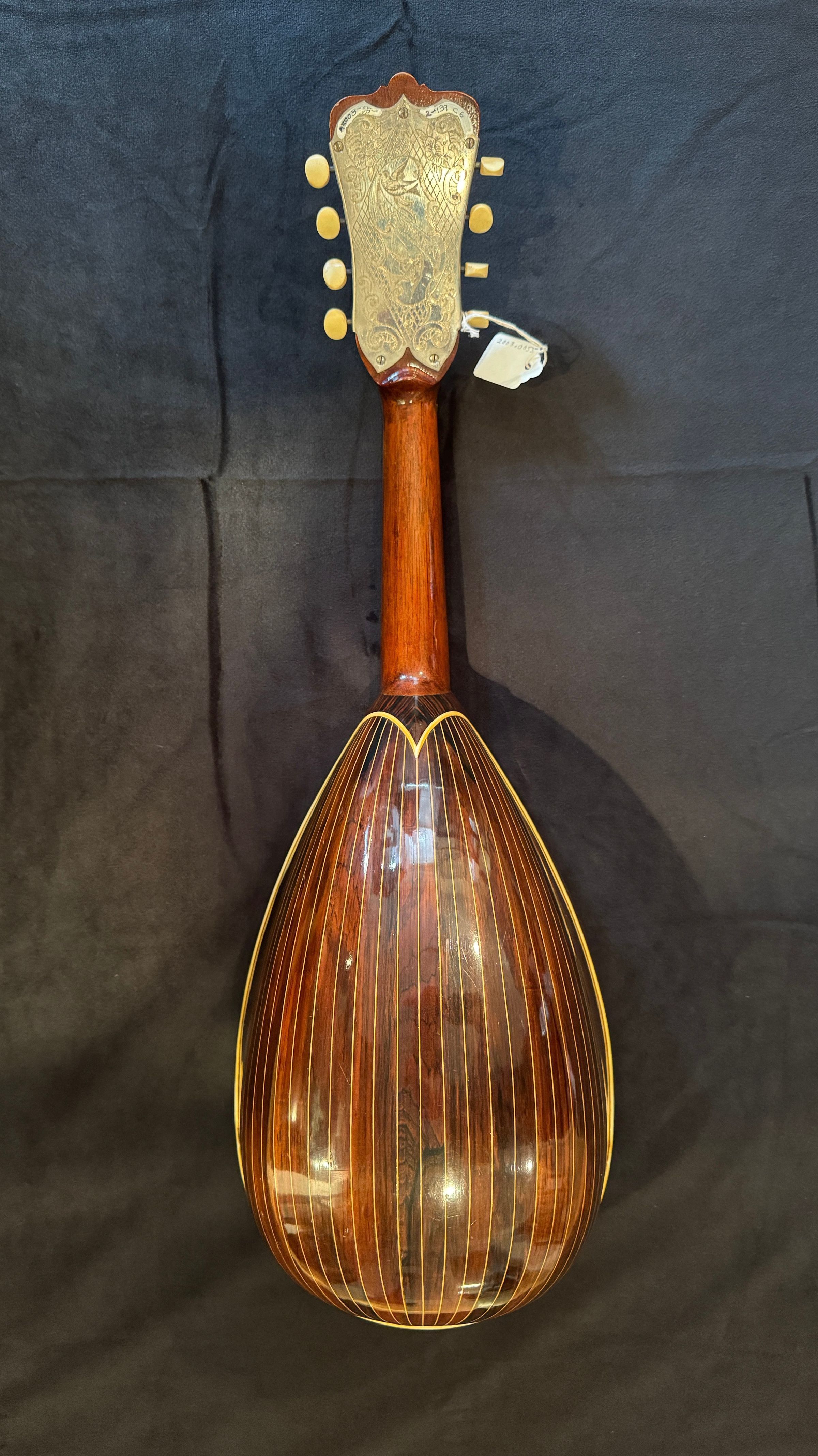 Mandolin made of wood with inlaid decoration including some tortoise shell and mother of pearl and ivory keys. Has 8 intact strings. Label visible inside says "The Washburn Best in the World" No. 19924 '" "Highest Award at World's Columbian Exposition Chicago 1893 - Gold medal and diploma of Honor Antwerp 1894." Slight wear from use but no inlay missing and finish almost like new. Probably dates to c. 1900 and used by Edgar Zobel. Also includes leather mandolin case. Handle broken, leather deteriorating but case still solid with clasps intact. In November 2010 mandolin on Pickard House piano top with case on floor below it.