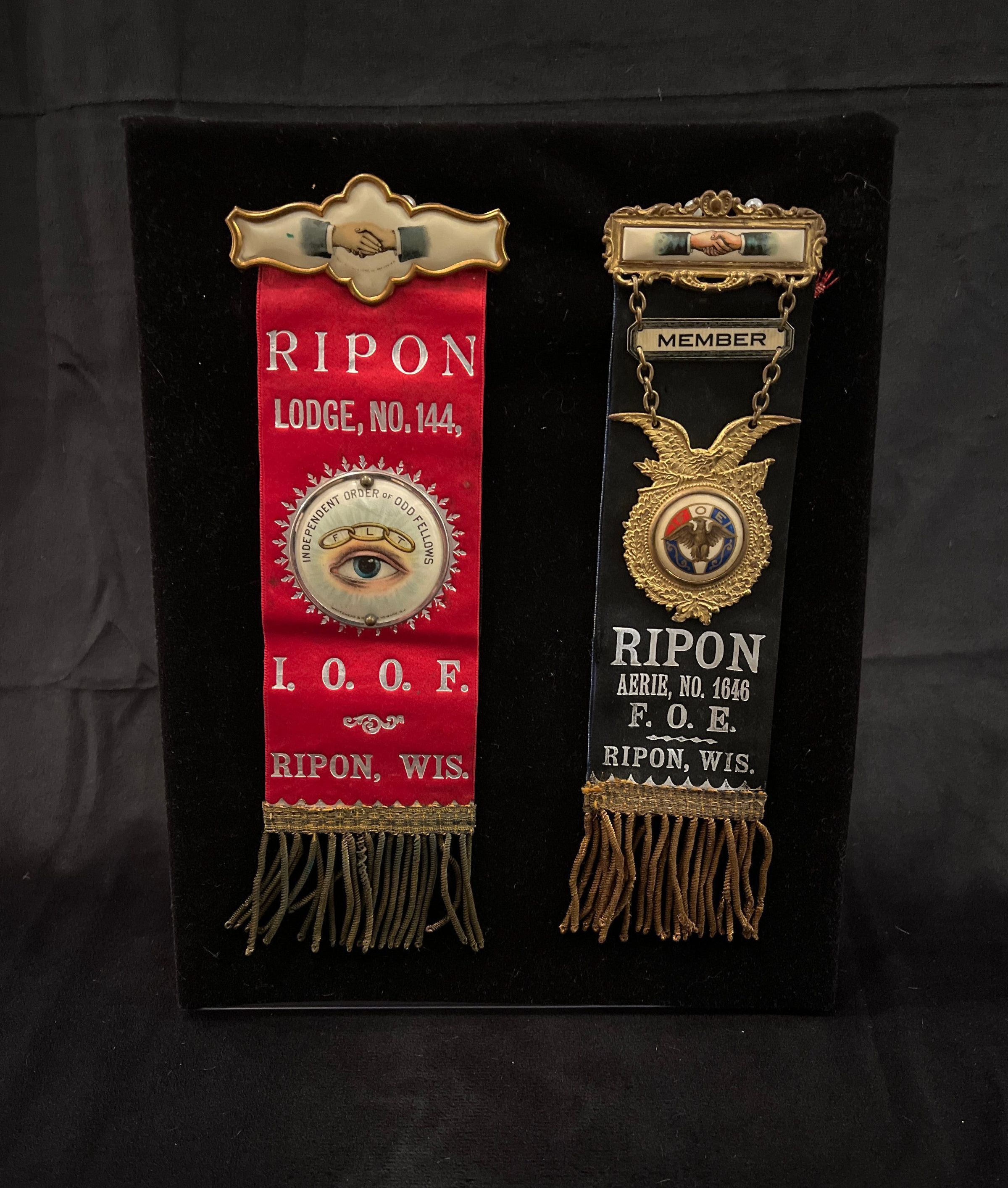 Badge, F.O.E. Ornate, member of Fraternal Order of Elks, Aerie No. 1646, Ripon, Wis. badge. Has enamel decorated metal pin and symbol of F.O.E. attached to silk ribbons, one black with recerse one of red, white and blue. With gold-fringed edge and printing in silver. Owner and date not available. Soiled and tarnished, but intact.Lexicon