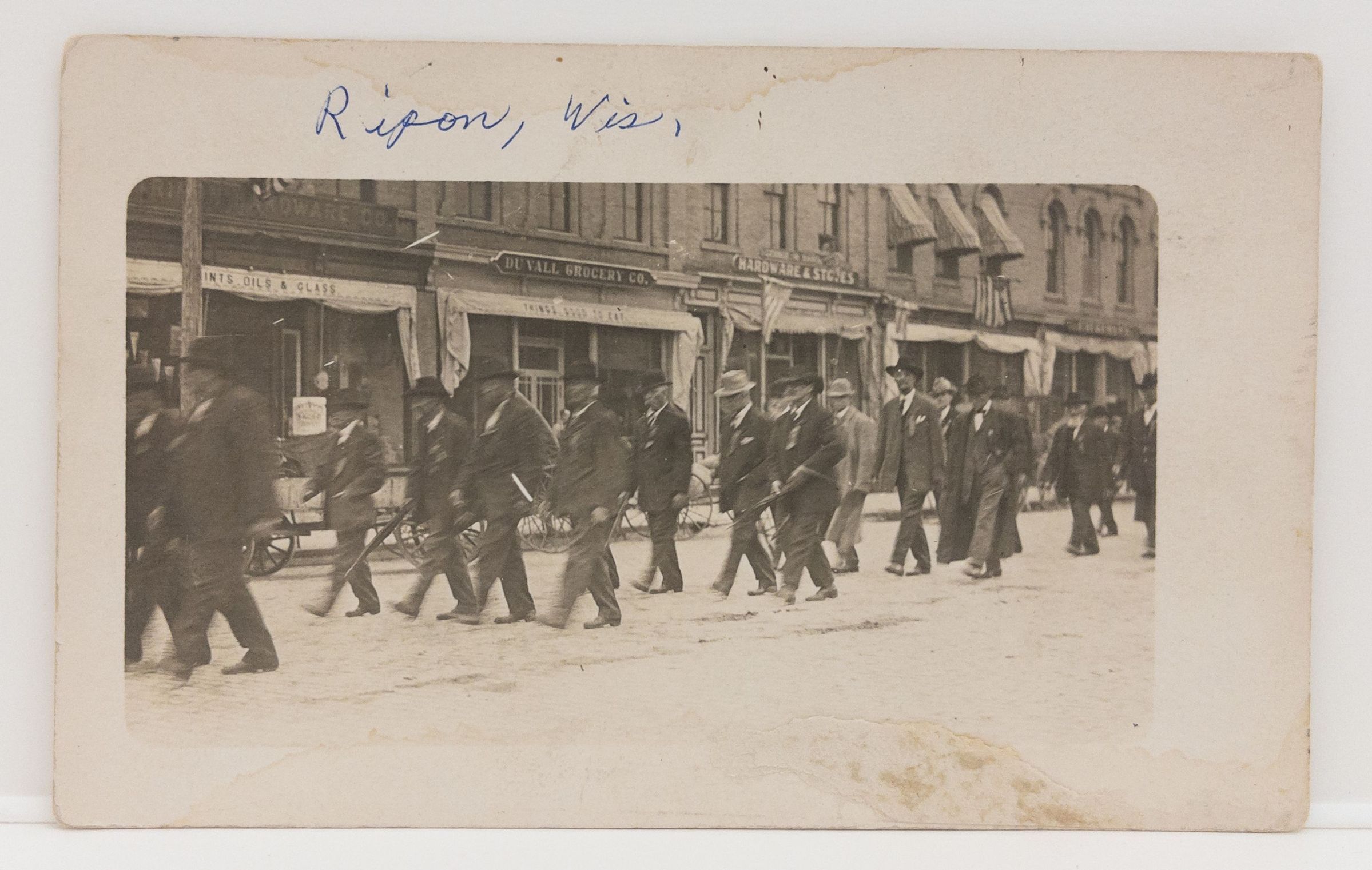 Postcard showing men walking on Watson. b&w. Men dressed in suits wearing ribbons. Some type of remembrance? Possible G.A.R. (Grand Army of the Republic)? Parts of photo blurred. Undated but street appears bricked so would be after 1901. Du Vall Grocery sign visible in background.