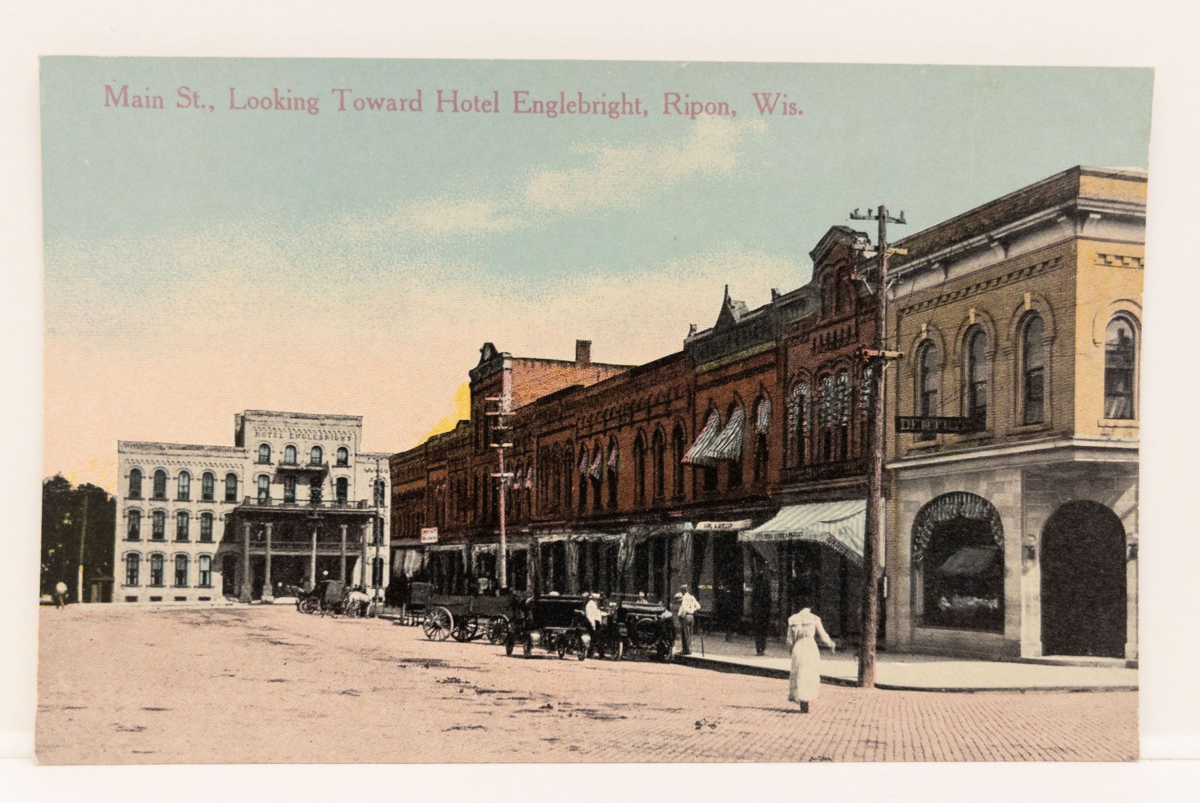 Colorized 3.5 x 5.5 photograph of 100 block east Watson on the Square looking north. Street bricked and automobiles visible as well as wagons. Face of card says Main St., Looking Towards Hotel Englebright, Ripon, Wis.Acquisition