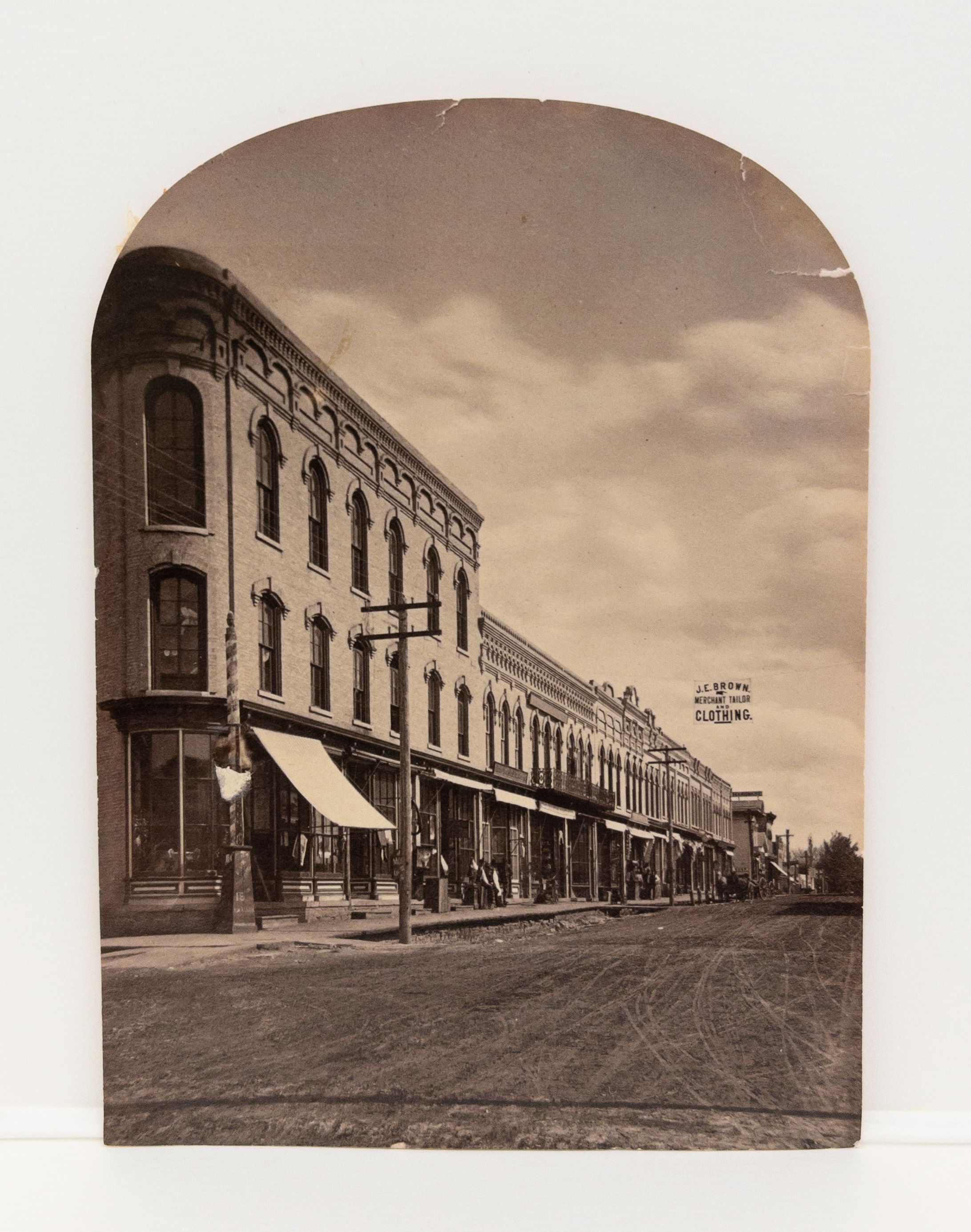 Black & white photo 3 x 4. 200 block east Watson between 1880 and 1900. Shows 205 Watson curved glass and entrance on Watson. Also shows telegraph poles (installed around 1883) and J.E. Brown Clothing sign suspended over street. Street not paved so before 1901.