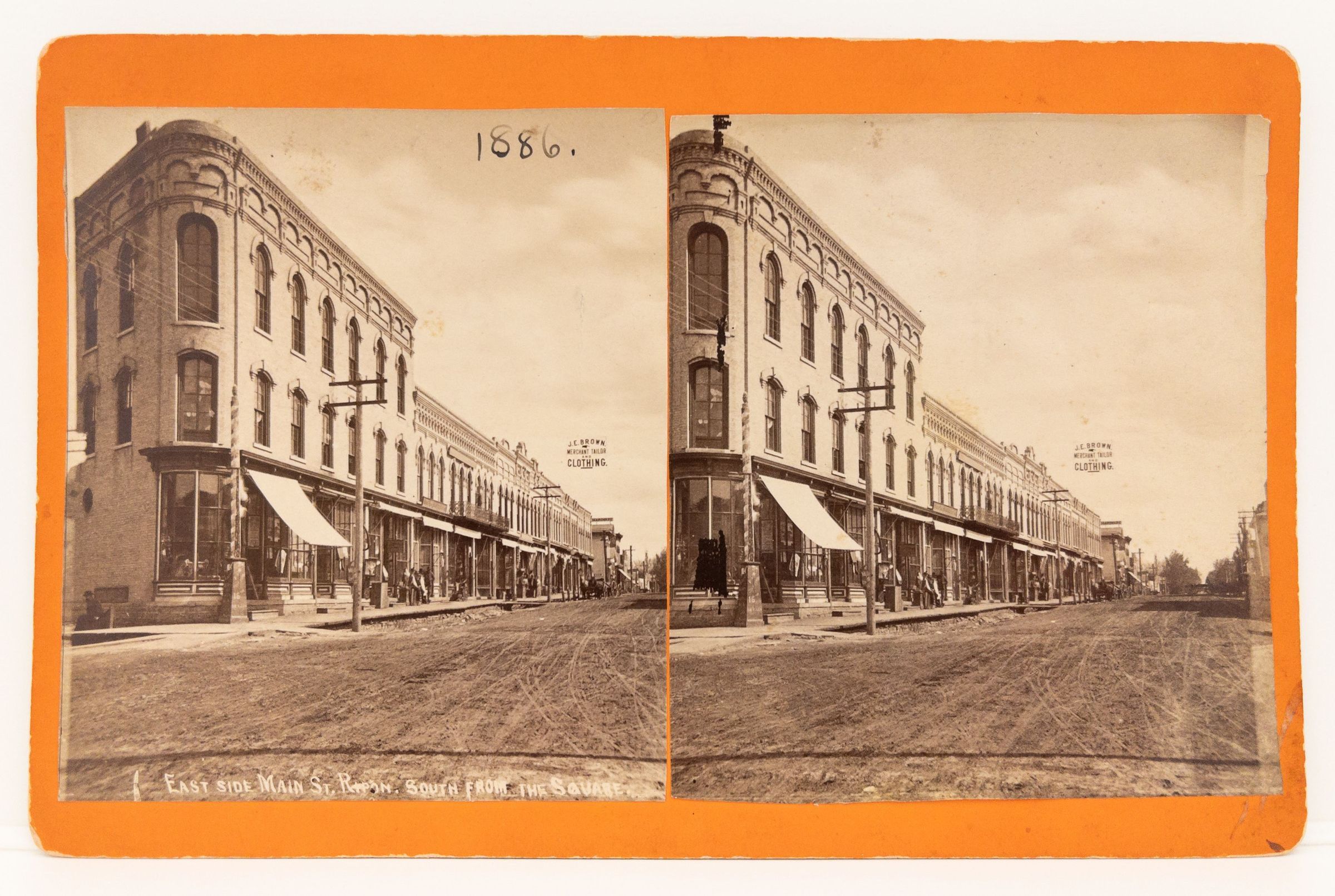 Stereograph of 200 block east Watson. Same view as 2006.0345.0143. Shows J. E. Brown Clothing sign suspended over Watson. 205 Watson with curved glass and entrance on Watson. 1886 written on face of stereograph. Bottom says east side Main St., Ripon. South from the Square.