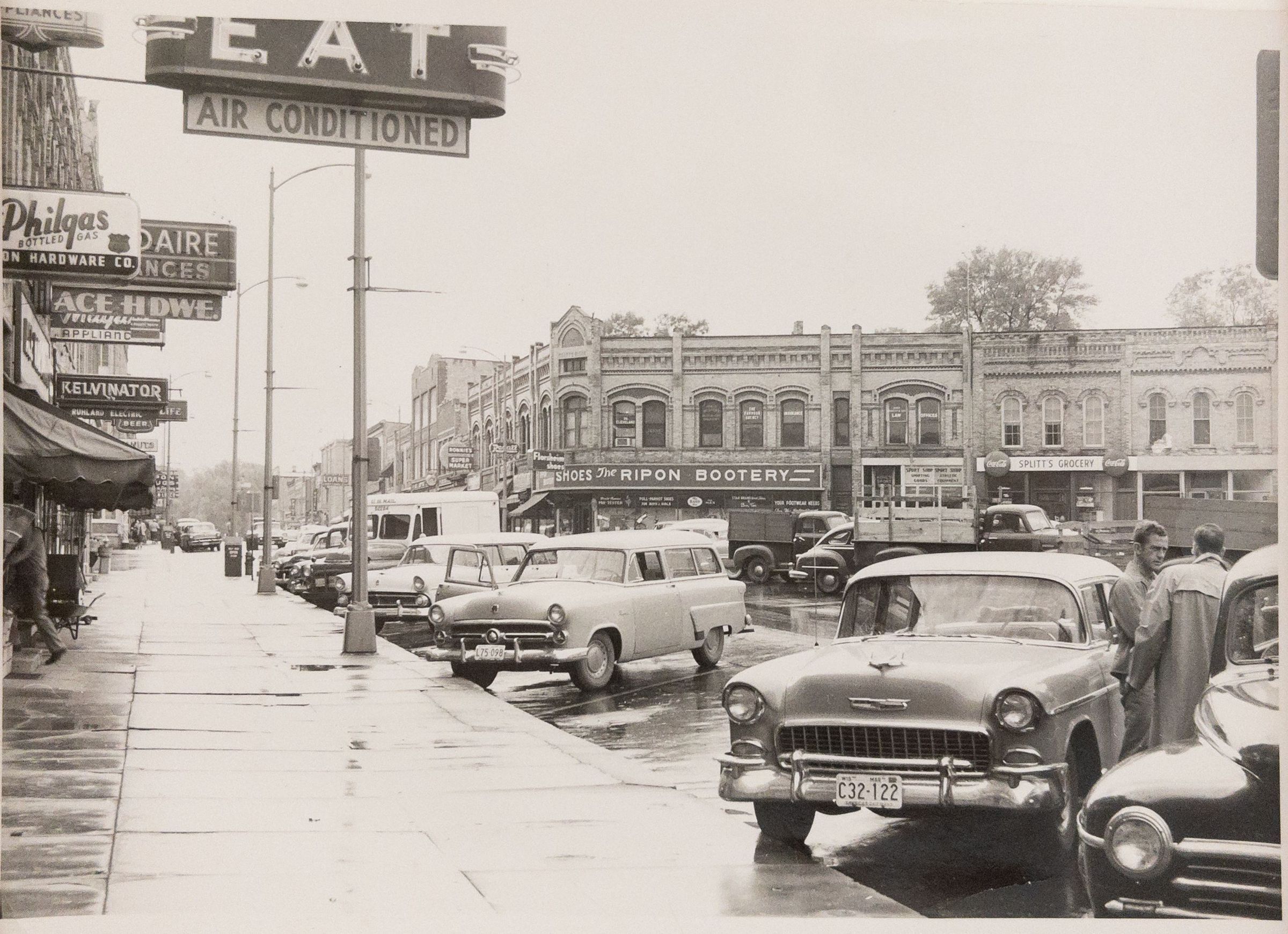 Black & white 5 x 7 photograph of the Square in Ripon 1950s. Taken from east side of 100 block looking southeast to Fond Du Lac and south on Watson. Businesses visible: Ace Hardware, Ronnie's Super Market, Rexall Drugs, Ripon Bootery, Dr. Cleveland, Splitt's Grocery (Roger Splitt). Pratt's Block can be seen at top of 200 Watson.Collection