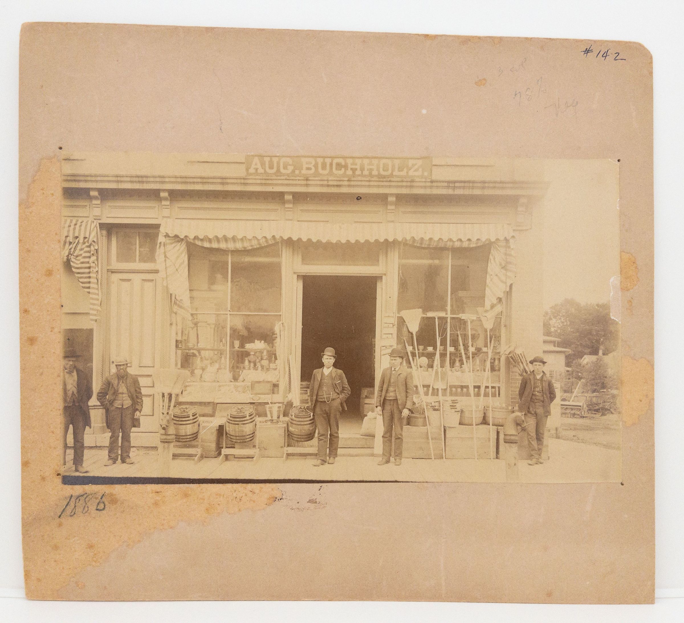 Black & white 8 x 8.75 photograph of Aug. Buchholz store front at 233 Watson, northeast corner of Watson and Blossom. Photo has 1886 written on front. Back says Marx (left); Mike Achtenbery; August, Julius, and Ed Buchholz. Hitching post visible in foreground on right.Acquisition