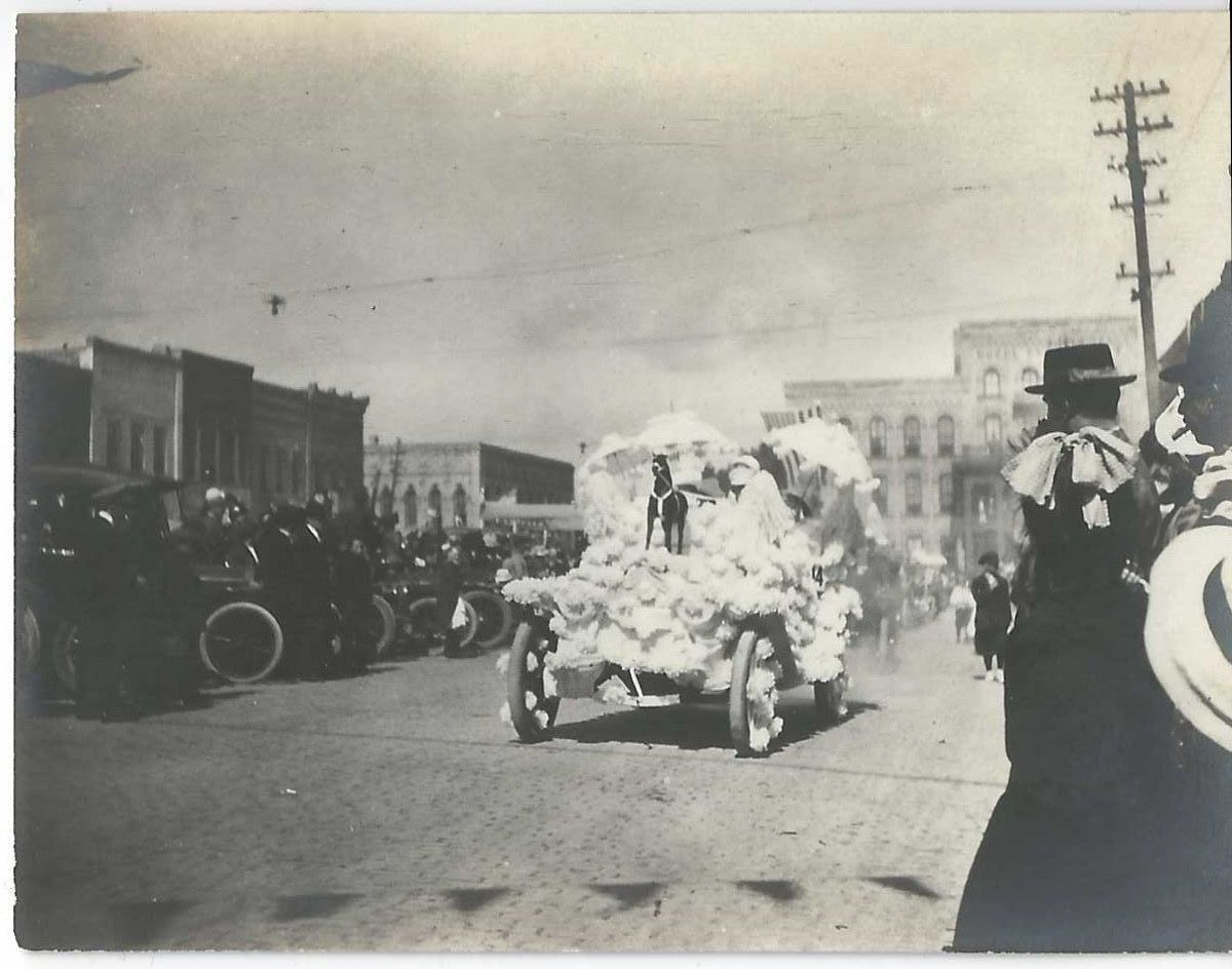 B&W photograph of parade in Ripon's square. Decorated car with horse ornament visible.