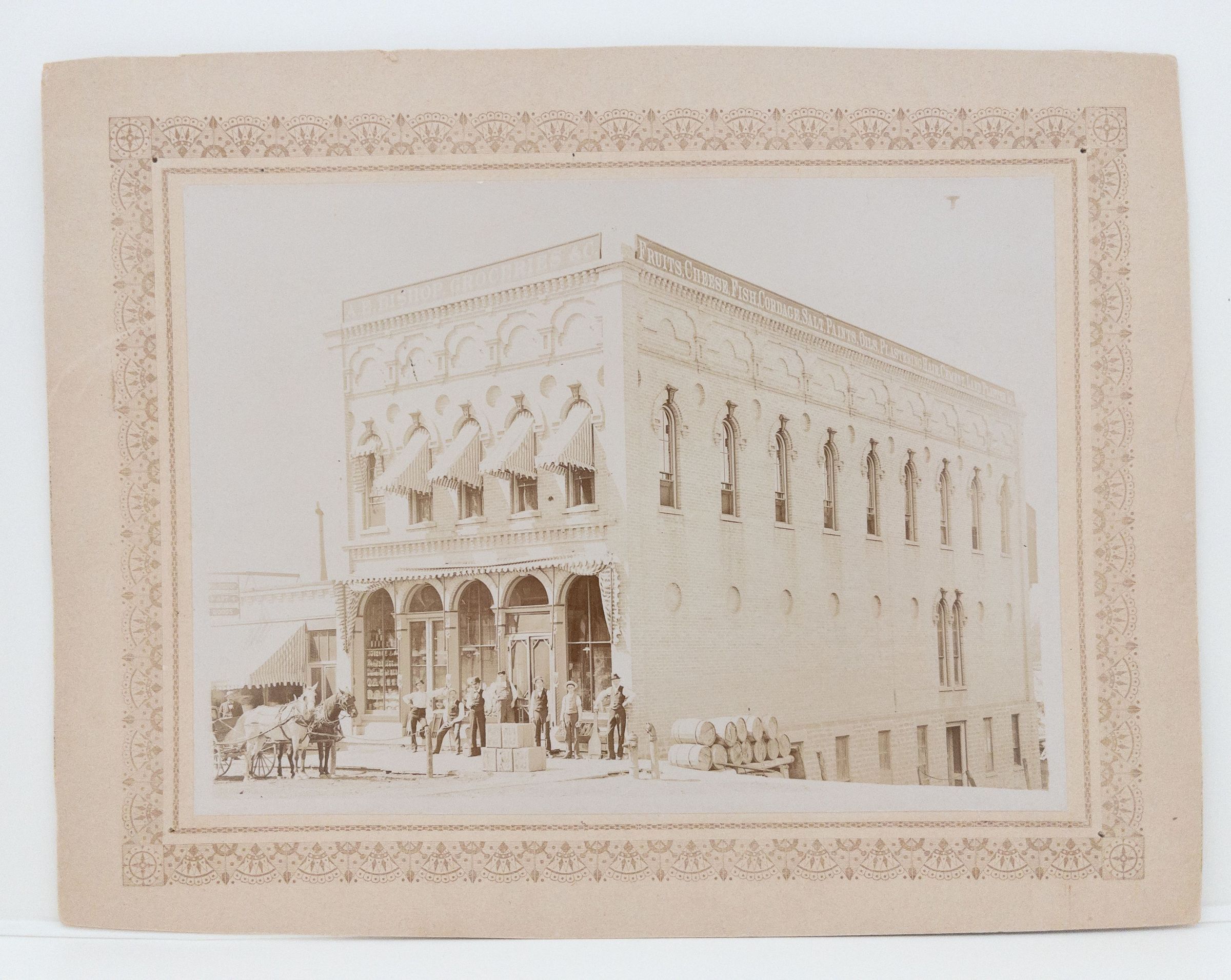 Black & white 7 x 9 photograph of A.E. Bishop Groceries located 1t 100-102 Jackson at north end of Square. Writing on back says person at far right is J.C. Bolzin, clerk and dates photo to around 1900. Typewritten summary says building probably built around 1870 for Byron Kingsbury. Bishop and Mrs. Bishop there around 1880-1910. Sign at very top of building says Fruits, Cheese, Fish, Cordage, Salt, Paints, Oils, Plastering Hair, Cement, Land PlasterAcquisition