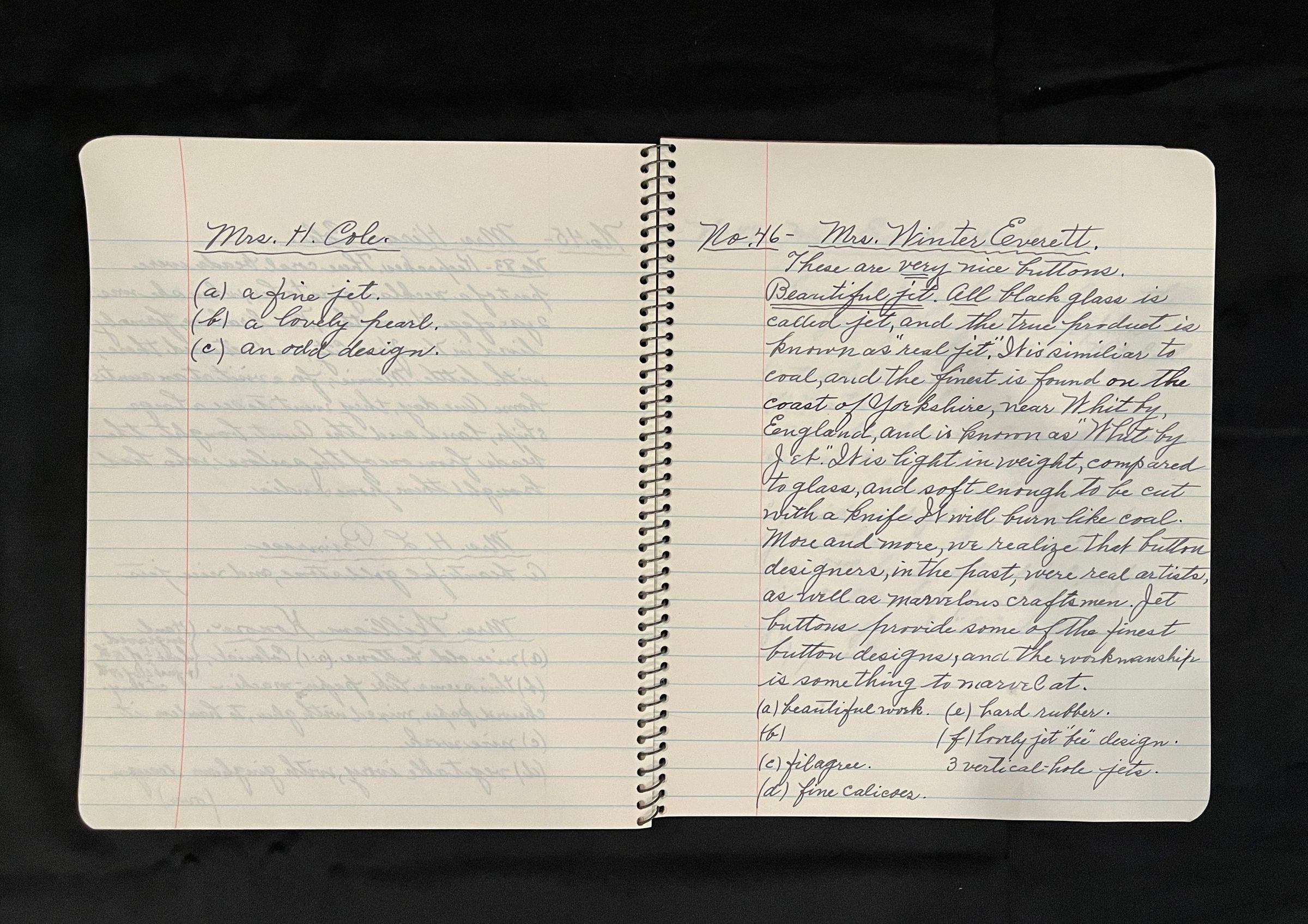 1 Box - Contains 2 sets of original, handwritten indexes by Belle Lawson highlighting specific buttons on cards. For Belle Lawson, every button had a story. Lawson kept detailed notes about each button in spiral notebooks. In her notebooks, she describes who owned each button, where each button came from, what it was made of, and any interesting features. Lawson realized that “button designers, in the past, were real artists, as well as marvelous craftsman.” Also contains original notes.