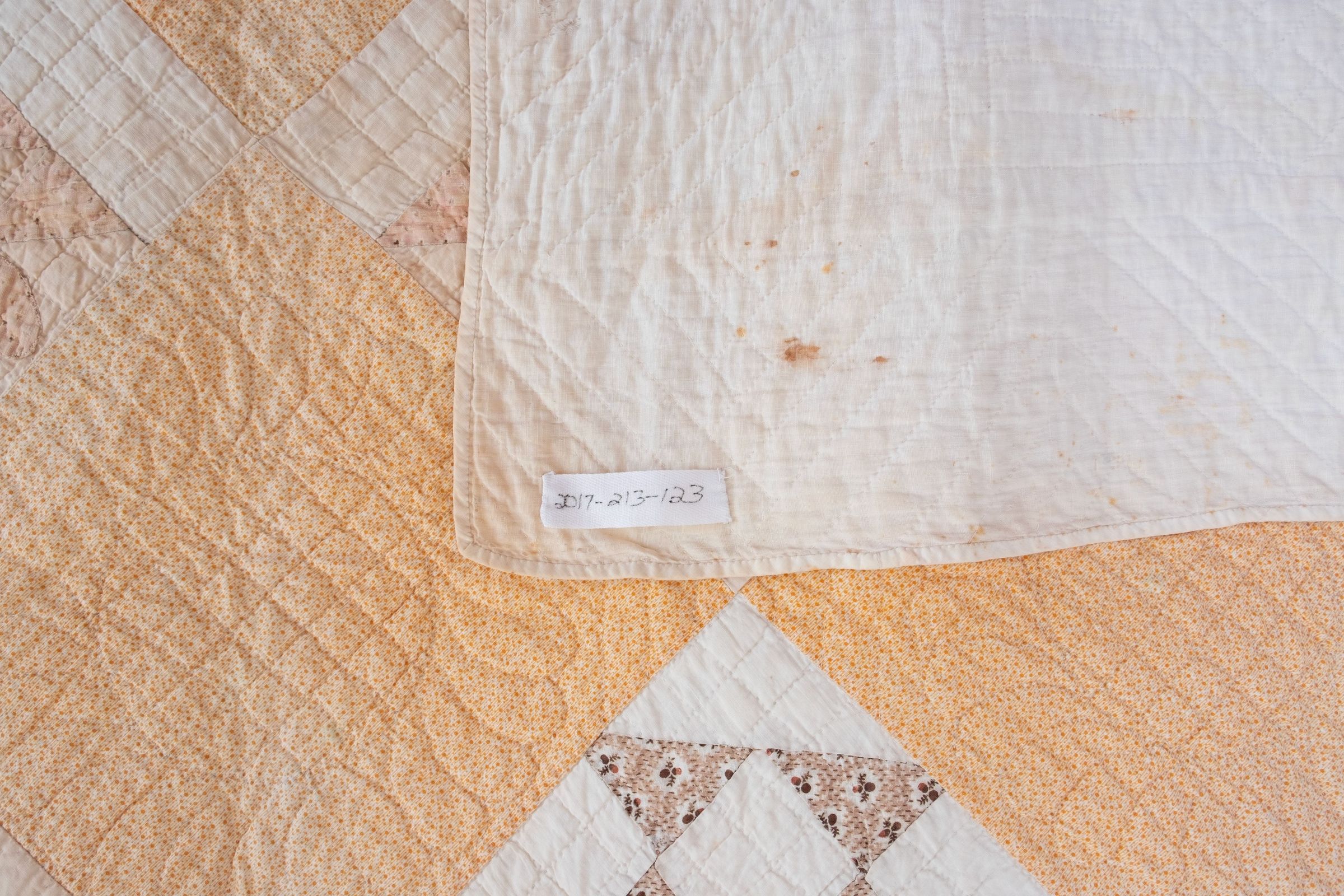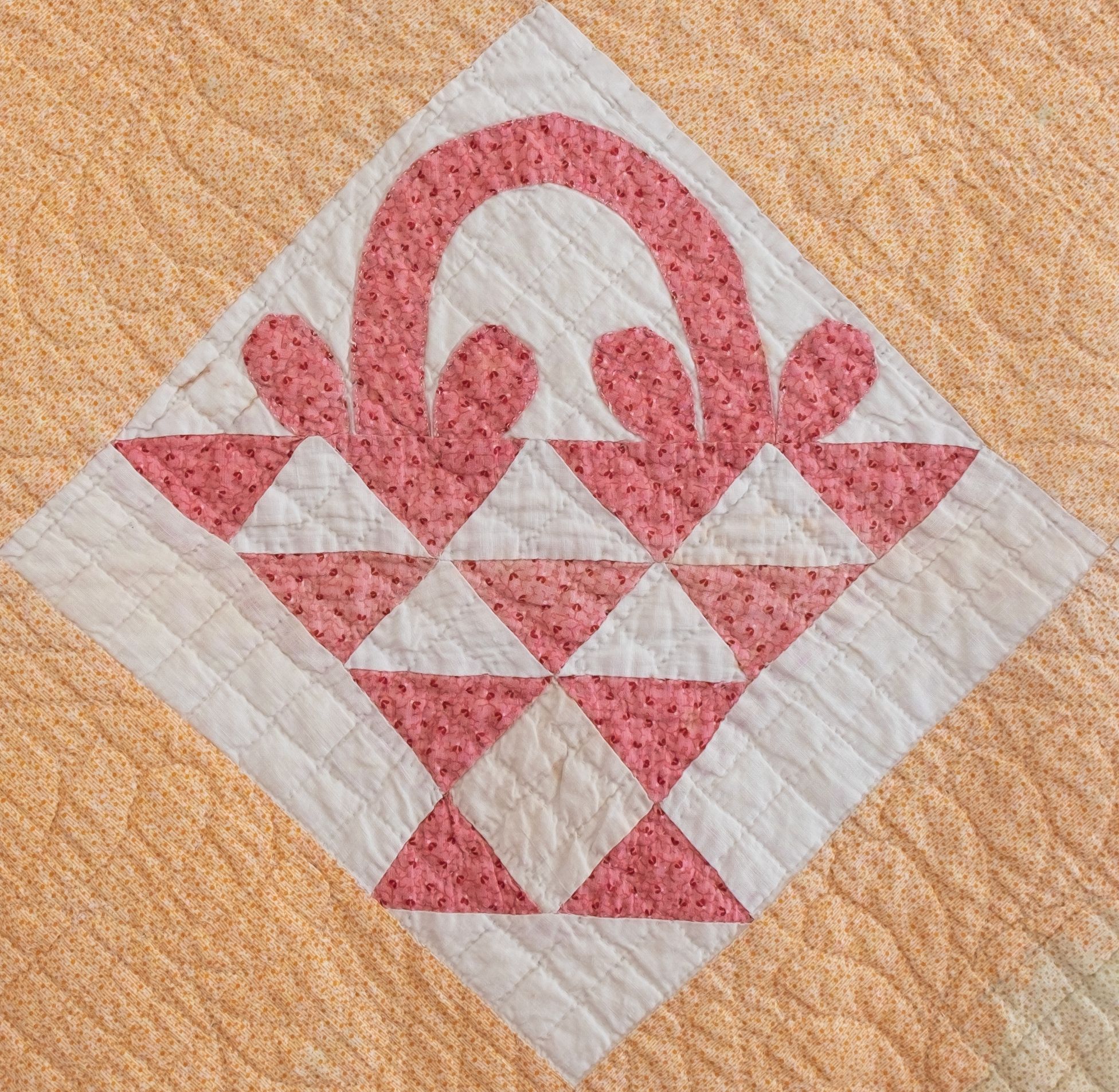 Quilt. Basket pattern of pink/red/tans. 90-1/2" x 76". Hand stitched and quilted. Blocks of butterscotch with round quilted pattern. 4-1/2" border of cream with 9" long triangles. Backed in cream cotton fabric.
