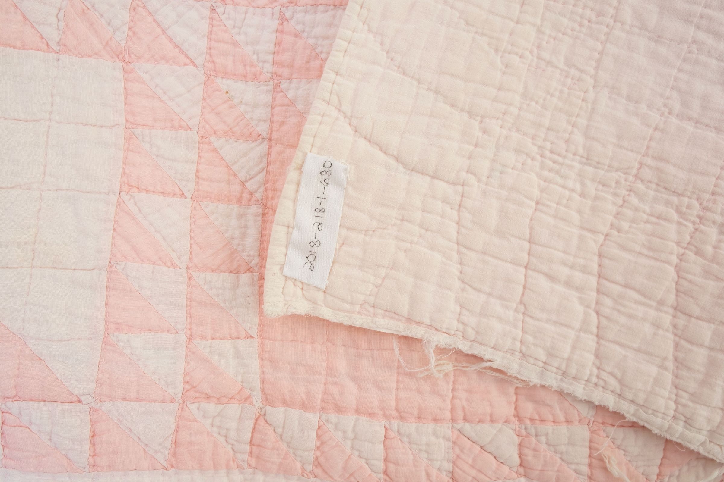 The quilt is light pink basket pattern with a 2" pink border and .5" white border. White backing. Hand quilting. Some fraying along the borders. 74.5' x 65".Collection