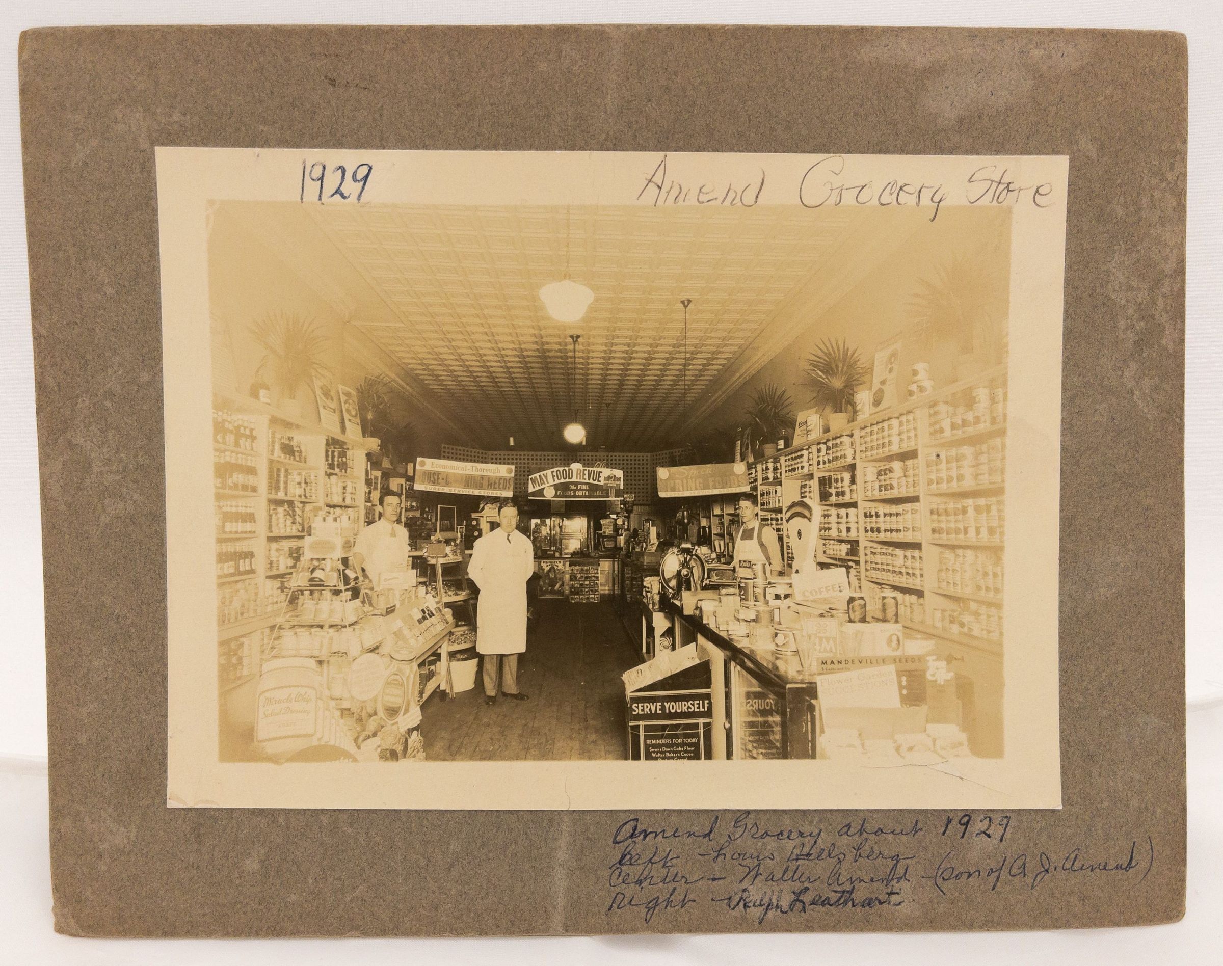 Black & white 7 x 9 photograph of Amend Grocery Store, 221 Watson, c. 1929. Note on back says: Amend's Grocery Store (present location of Liberty Tavern) Left: Louis Hielsberg, center: Walter Amend (son of A.J. Amend), right: Ralph Leathart about 1929. Property of Mrs. Gilbert W. LambertAcquisition