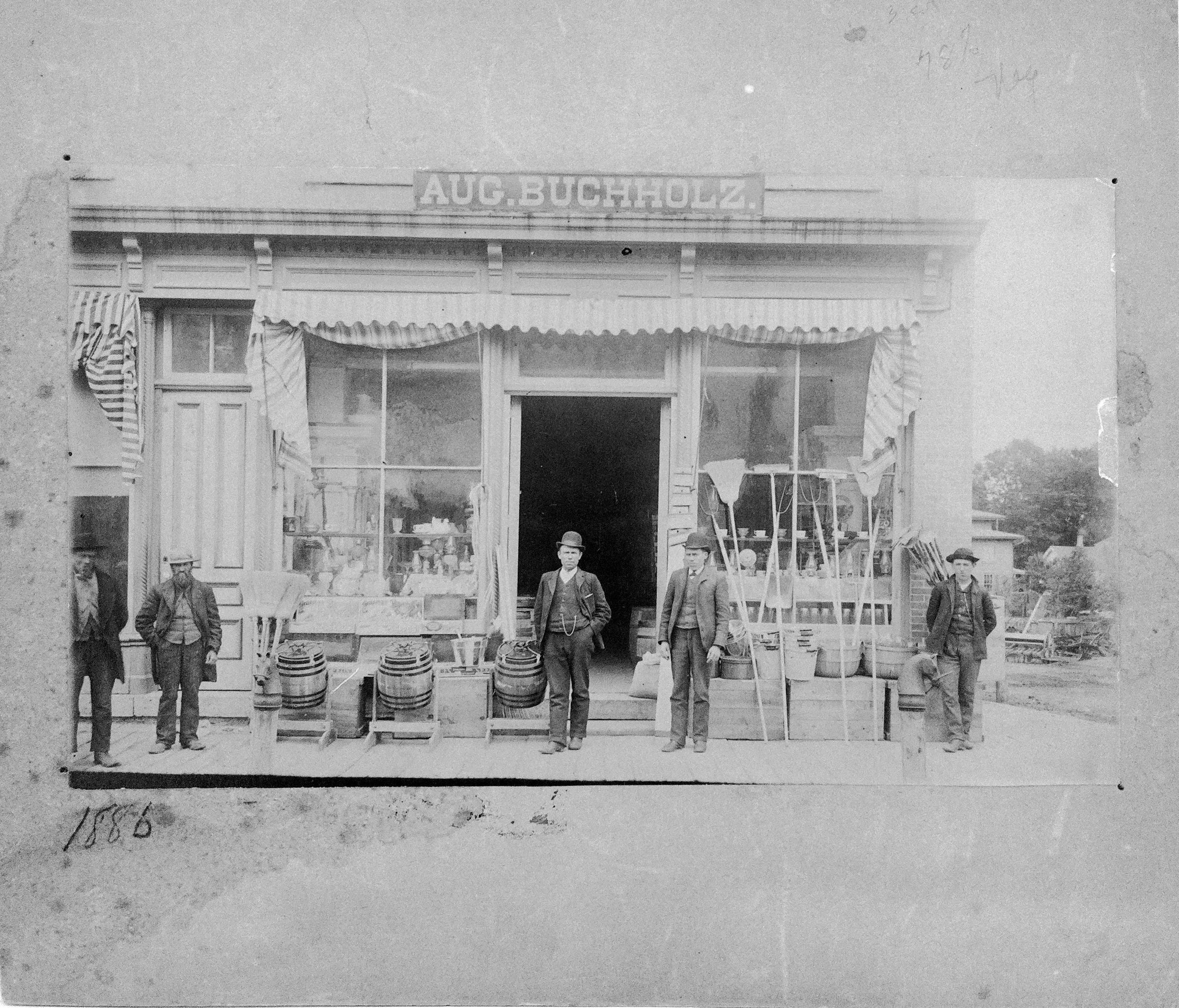 Black & white 8 x 8.75 photograph of Aug. Buchholz store front at 233 Watson, northeast corner of Watson and Blossom. Photo has 1886 written on front. Back says Marx (left); Mike Achtenbery; August, Julius, and Ed Buchholz. Hitching post visible in foreground on right.Acquisition