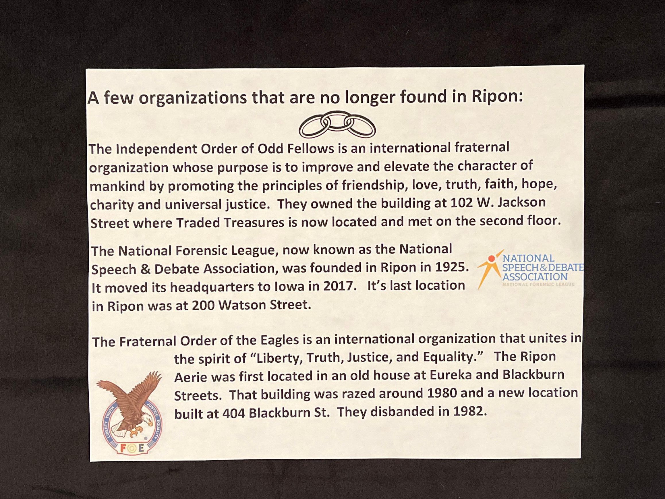 Badge, F.O.E. Ornate, member of Fraternal Order of Elks, Aerie No. 1646, Ripon, Wis. badge. Has enamel decorated metal pin and symbol of F.O.E. attached to silk ribbons, one black with recerse one of red, white and blue. With gold-fringed edge and printing in silver. Owner and date not available. Soiled and tarnished, but intact.Lexicon