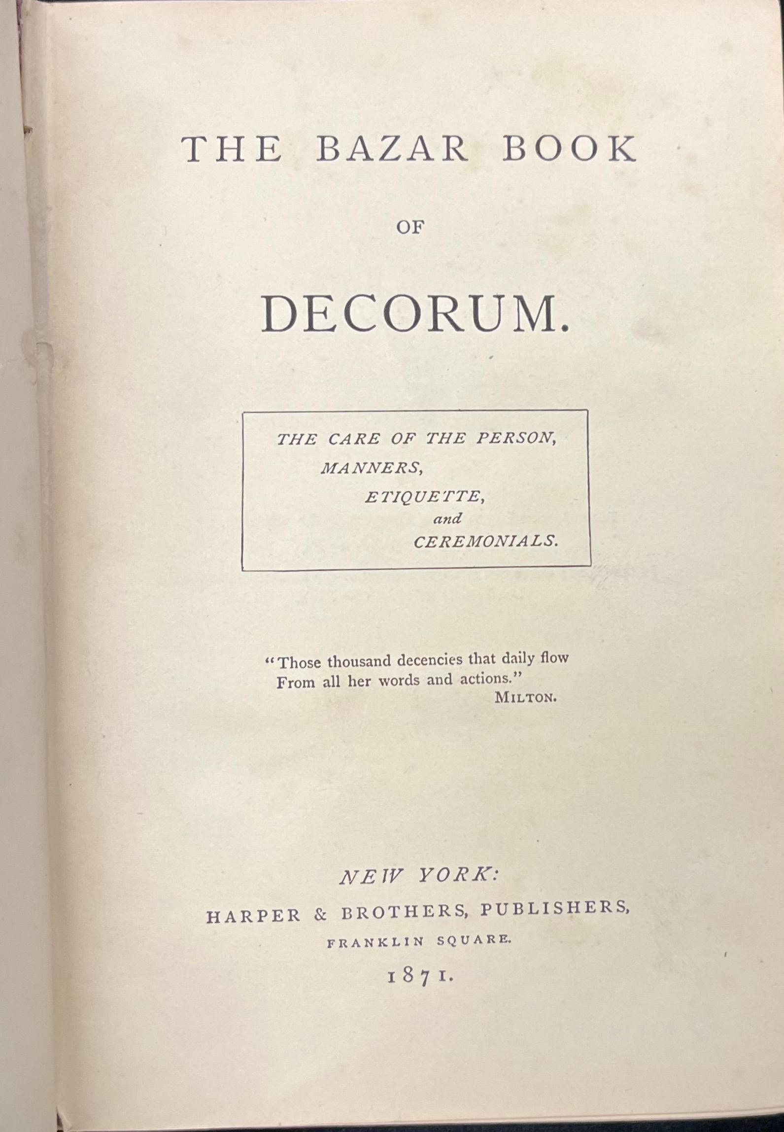 The Bazar Book of Ddecorum. The care of the person, manners, etiquette and ceremonials