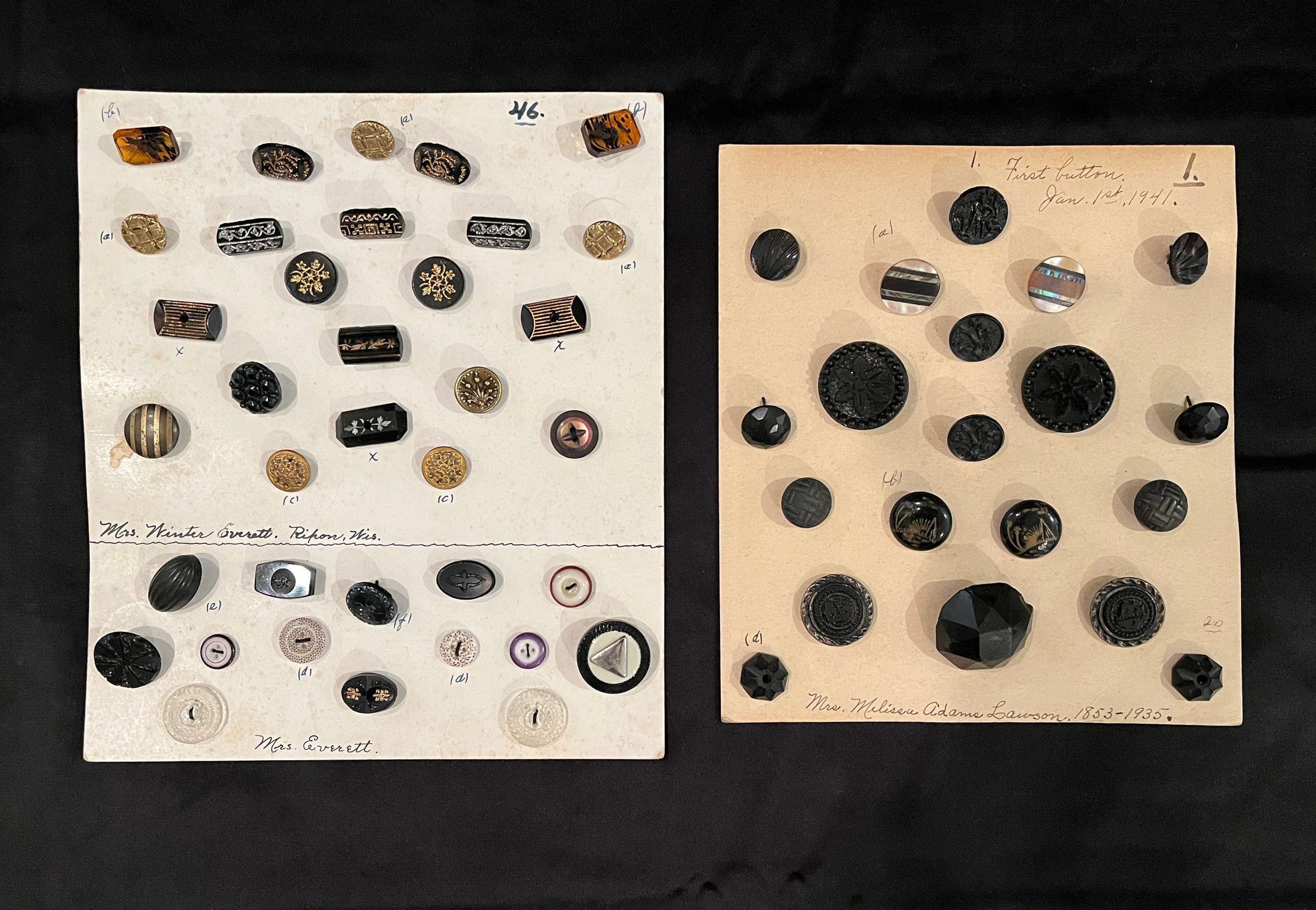 Belle Lawson’s button collection consists of 115 cards with buttons sewn on, like the two currently on display. The buttons within the collection vary from military uniform buttons to buttons collected from locations or donors, or they might be examples of engraving, design, or material.