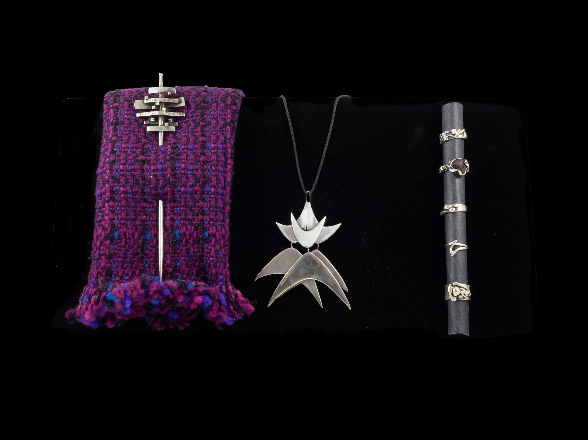 People started making jewelry around 25,000 years ago. Somewhere around the end of the 4th millennium BC inhabitants of modern-day Turkey learned how to extract silver from lead. After this time silver jewelry started to be made, sometimes as rings which acted as currency. Klapperich is well known in the area for her spinning and weaving skills. The silver pin is displayed on a scrap from a woven shawl she created. Klapperich received both a bachelor's and master's degree in Art Education from UW-Milwaukee and came to Ripon in 1960. She taught art at the middle and high school levels in the Ripon School District for 38 years. She also handled costume design for the high school drama program. During the summer she taught art to children enrolled at the Ripon College ACE (Advanced