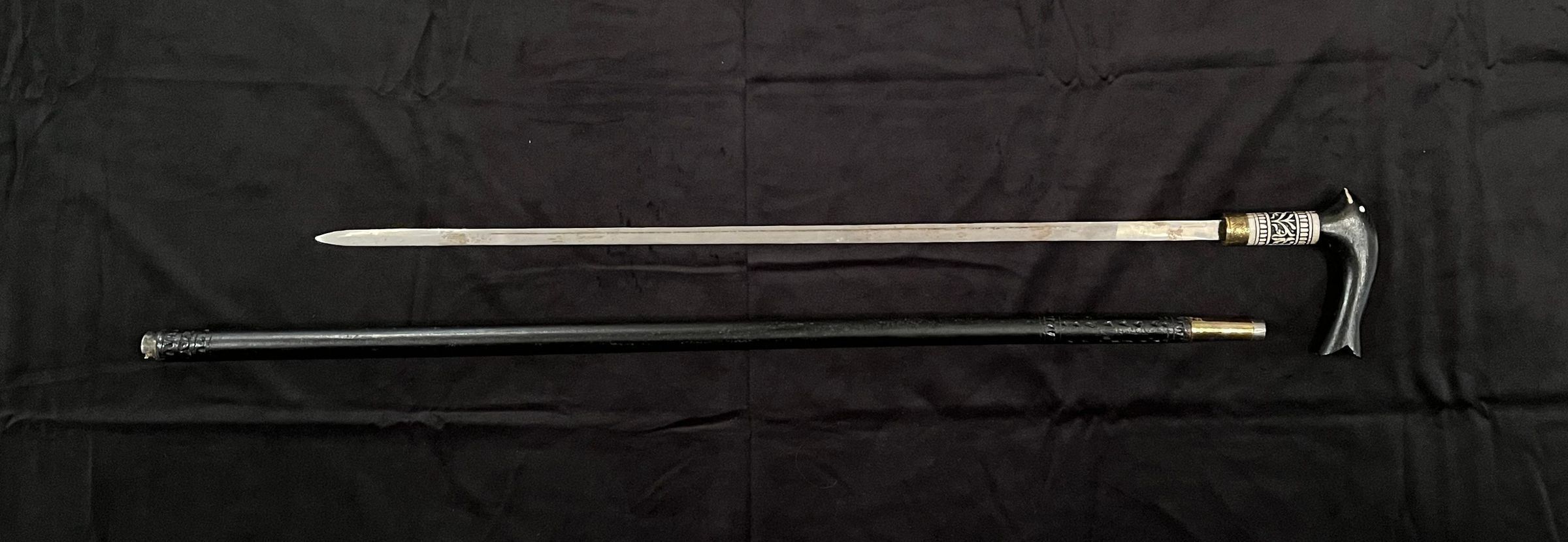 Cane, sword: Carved black wood cane with fish shaped handle carved ivory like neck and brass ring. Brass tip on bottom - Handle unlocks to expose steel sword attached to handle. Belonged to " Count " Lawrence Masche b. 2/5/1902 d. 3/24/1984, husband of Irene Hoffman Masche. Used , minimal signs of wear.Context