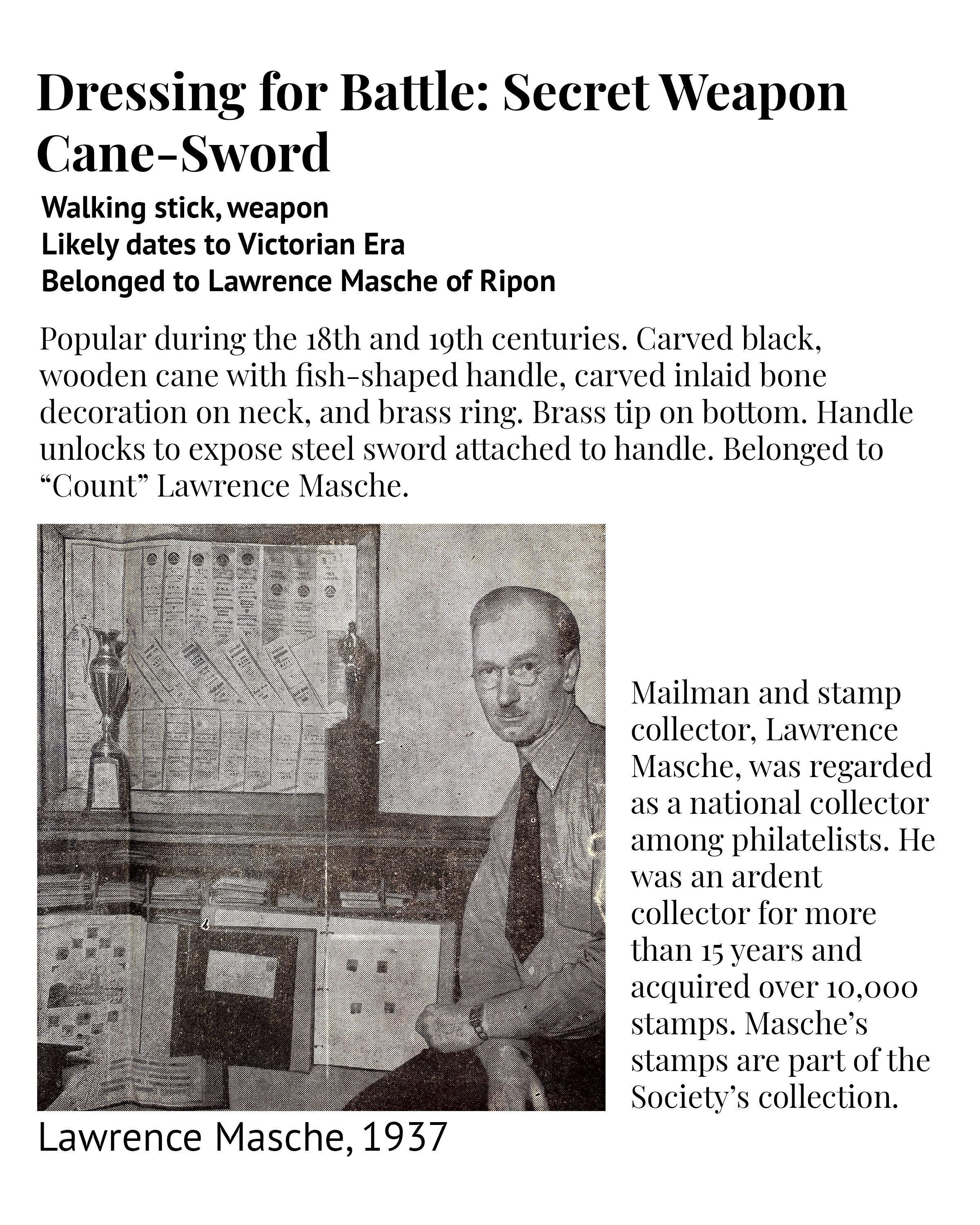 Popular during the 18th and 19th centuries. Carved black, wooden cane with fish-shaped handle, carved inlaid bone decoration on neck, and brass ring. Brass tip on bottom. Handle unlocks to expose steel sword attached to handle. Mailman and stamp collector, Lawrence Masche, was regarded as a national collector among philatelists. He was an ardent collector for more than 15 years and acquired over 10,000 stamps. Masche’s stamps are part of the Society’s collection.Acquisition