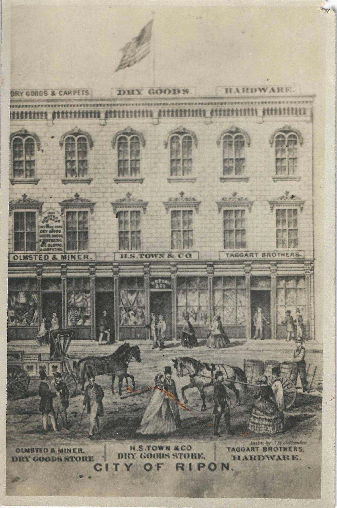 Black & white 6.5 x 4.5 card showing three-story building 100 block west side of Square. Shows 3 businesses: Olmsted & Miner Dry Goods, H.S. Town & Co. Dry Goods, Taggart Brothers Hardware Signs at top of building say dry goods & carpets, dry goods, and hardware. American flag visible at top of building. Street scene in front. Back of card is stamped: Finished by Parfitt's Studio, Ripon, Wis.Acquisition