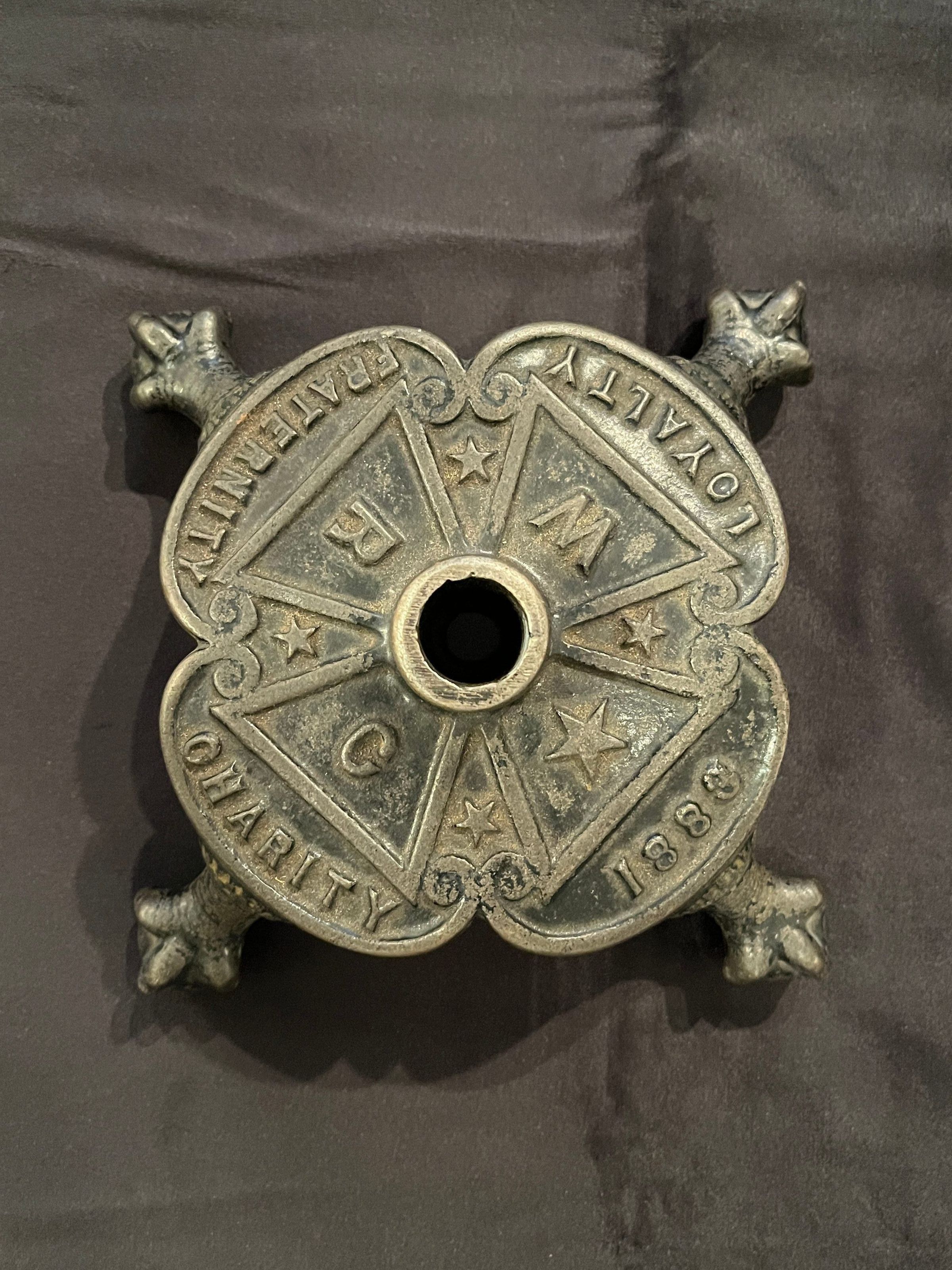 Cast iron flag holder, four claw feet. Top reads “WRC,” “Loyalty, Fraternity, Charity, 1883.”Context