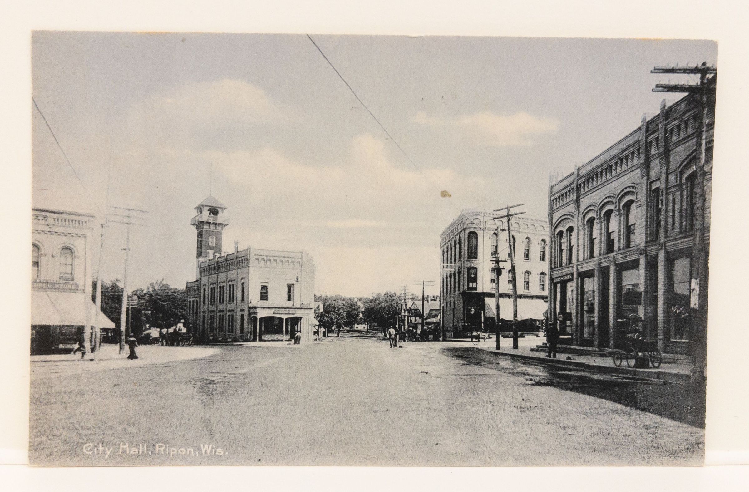 Back of card calls for 1 cent stamp. Face of card says City Hall, Ripon, Wis. Also shows portions of 123 Watson, 205 Watson, and W. Fond du Lace storefront on right. Horse and carriages/wagons visible.Acquisition