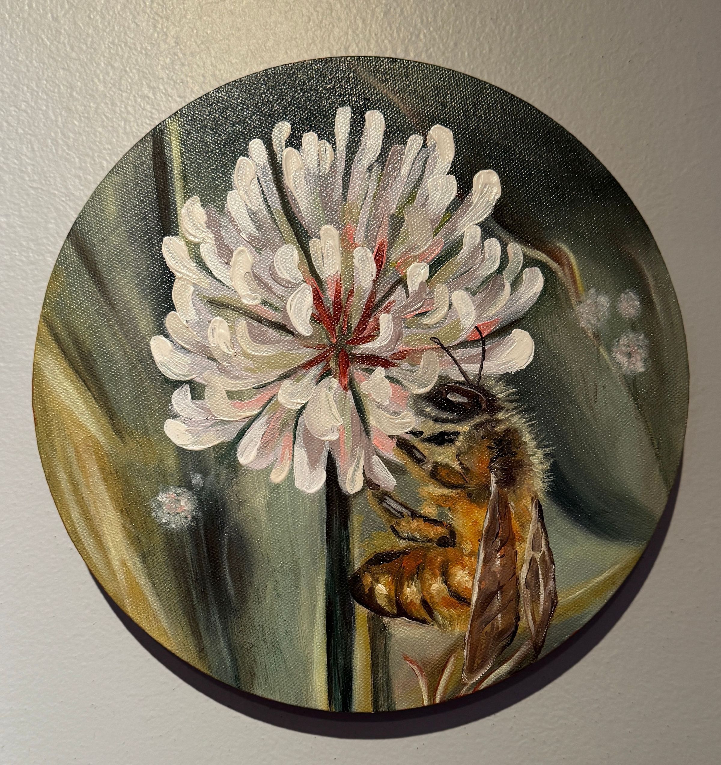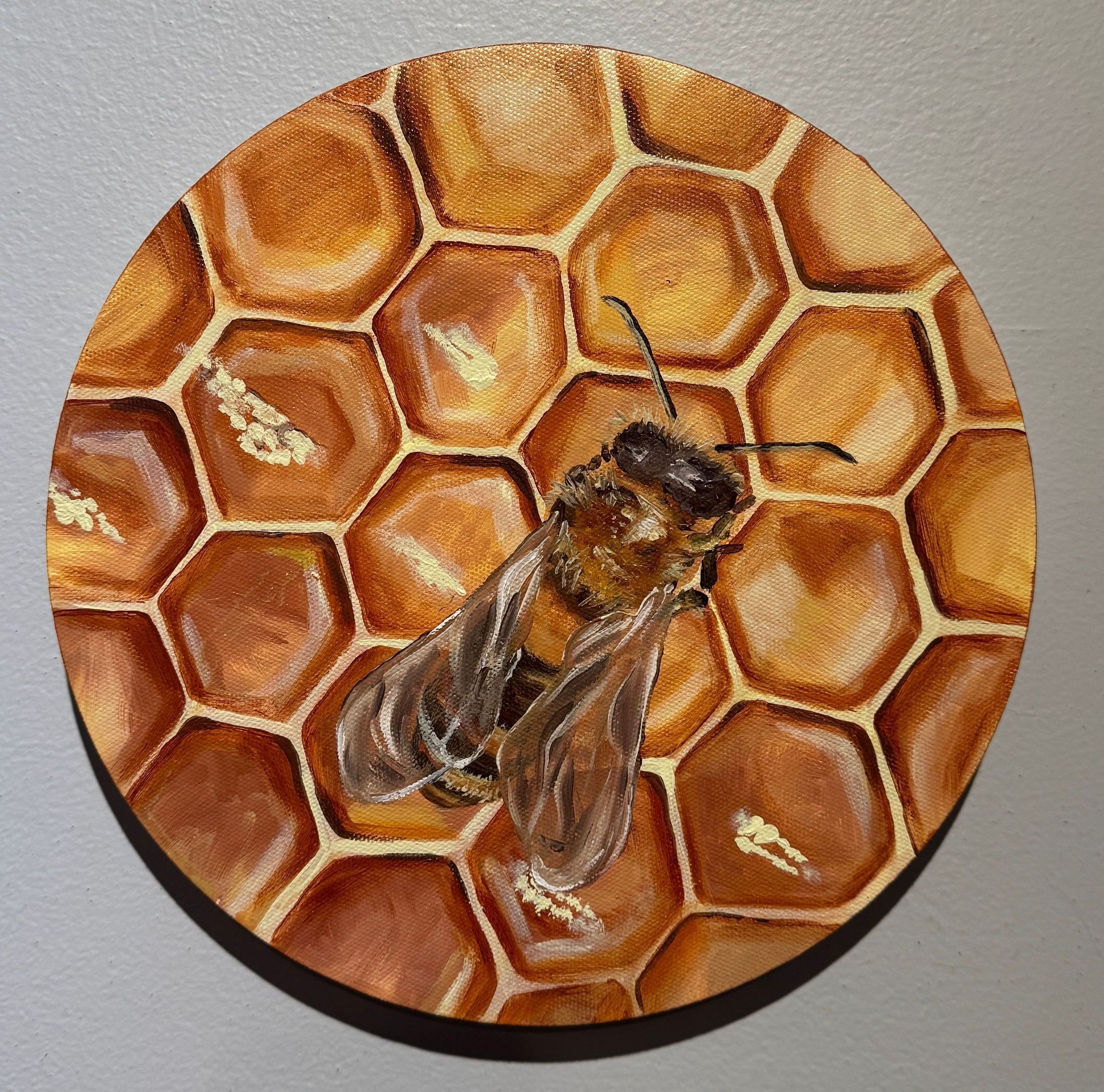 Artist Statement: Inspired by the former Schultz Honey Farm of Ripon, these twin circular oil paintings honor the enduring rhythm of the honeybee. Though the name has faded, their work continues humming through clover and comb. One feasts on white clover, the other tends golden honeycomb, a tribute to labor, renewal, and the sweetness of nature’s persistence.Context
