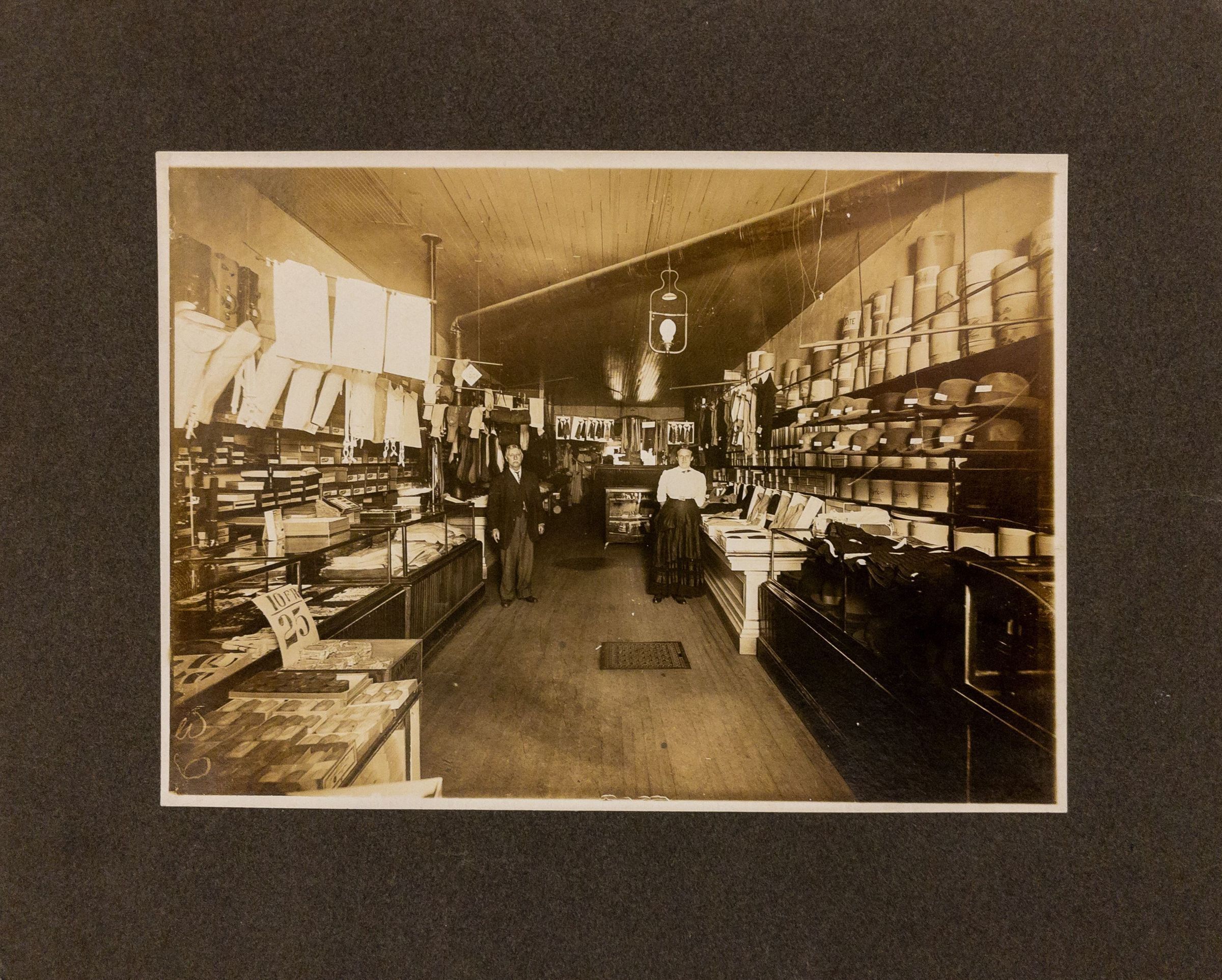 Black & white 8 x 10 photograph of interior of clothing store. Ties, hats, Mens' slacks visible. Also some type of corset and soaps. Man in suit and woman in waist and skirt standing in middle of picture.