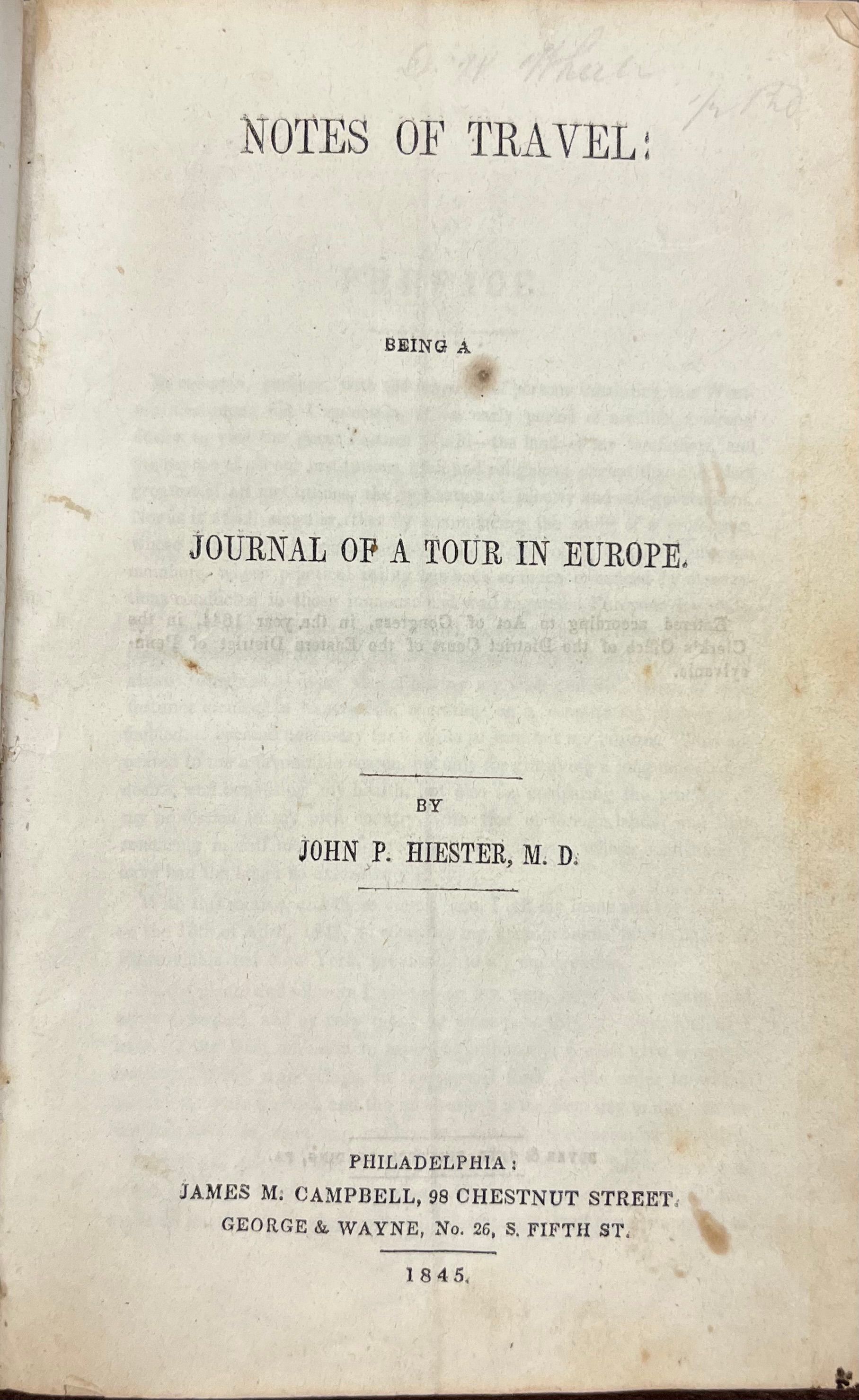 Notes of travel: being a journal of a tour in Europe by John P. Hiester, M.D.