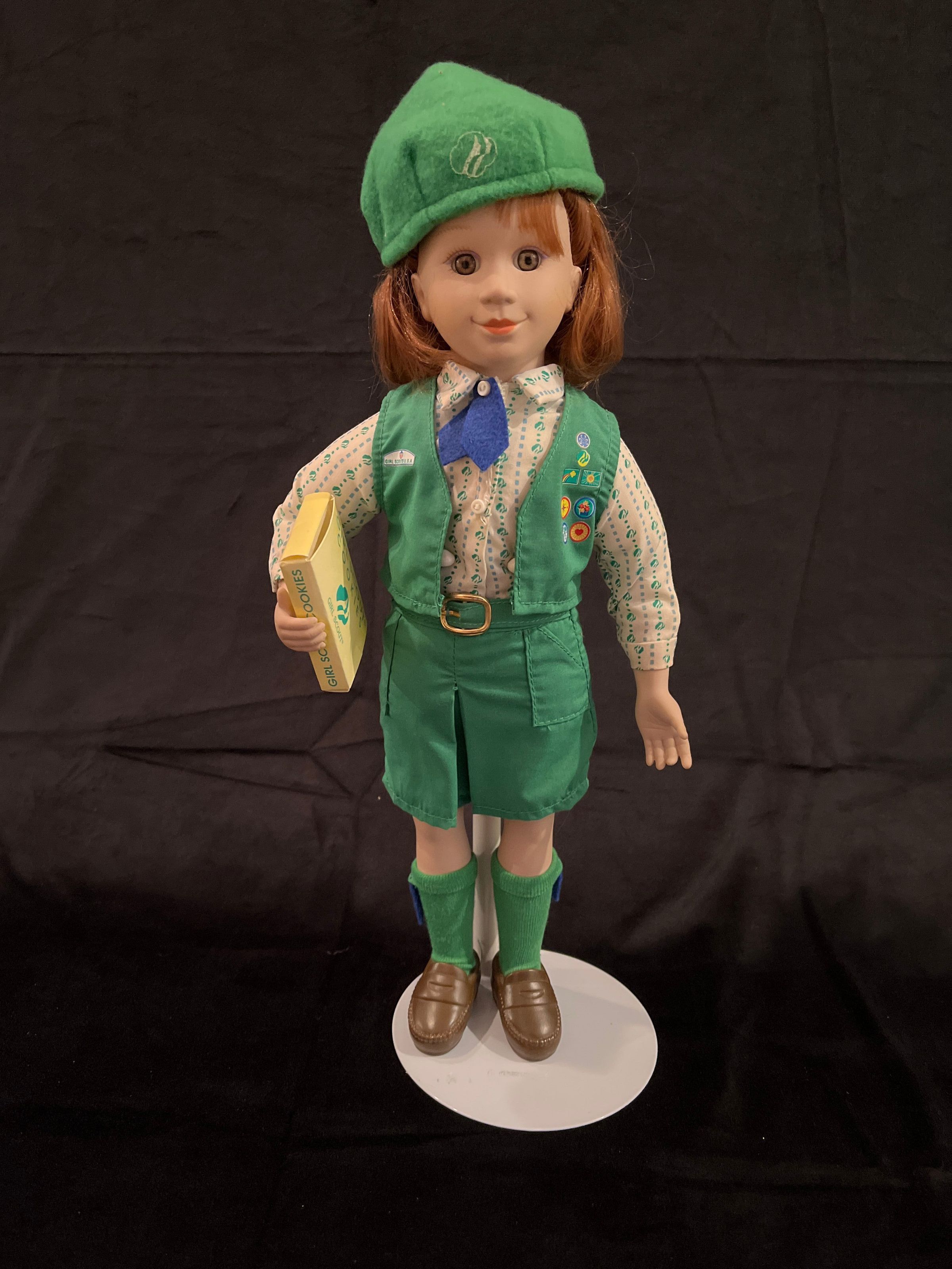 14" doll with bisque head and composition body jointed at the neck, elbows and thighs. Head has red hair, inset immovable eyes and closed mouth. Dressed in green girl scout uniform and green hat with girl scout emblem. Holding a box of girl scout cookies.Context