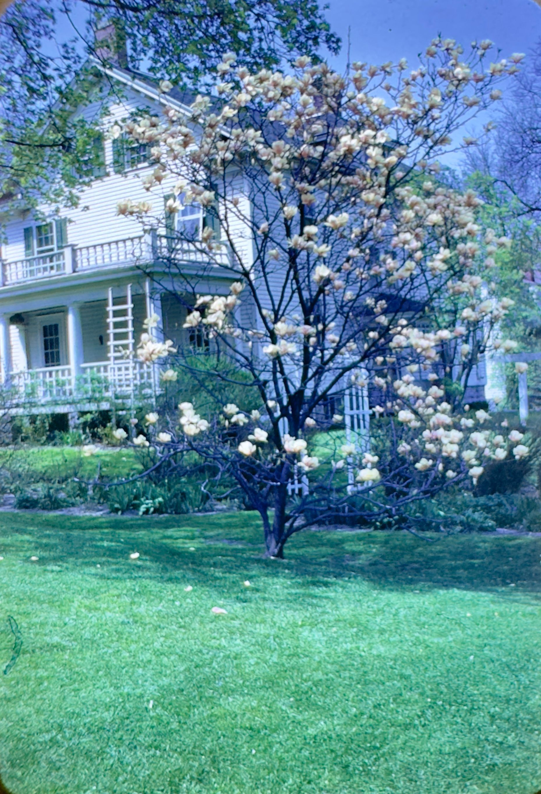 Dr EC Johnson house (523 Woodside) with Dr. JM Johnson's (529 Woodside) magnolia tree next door. Note 2025: Photo appears taken from 529 Woodside back yard looking north toward 523 Woodside.