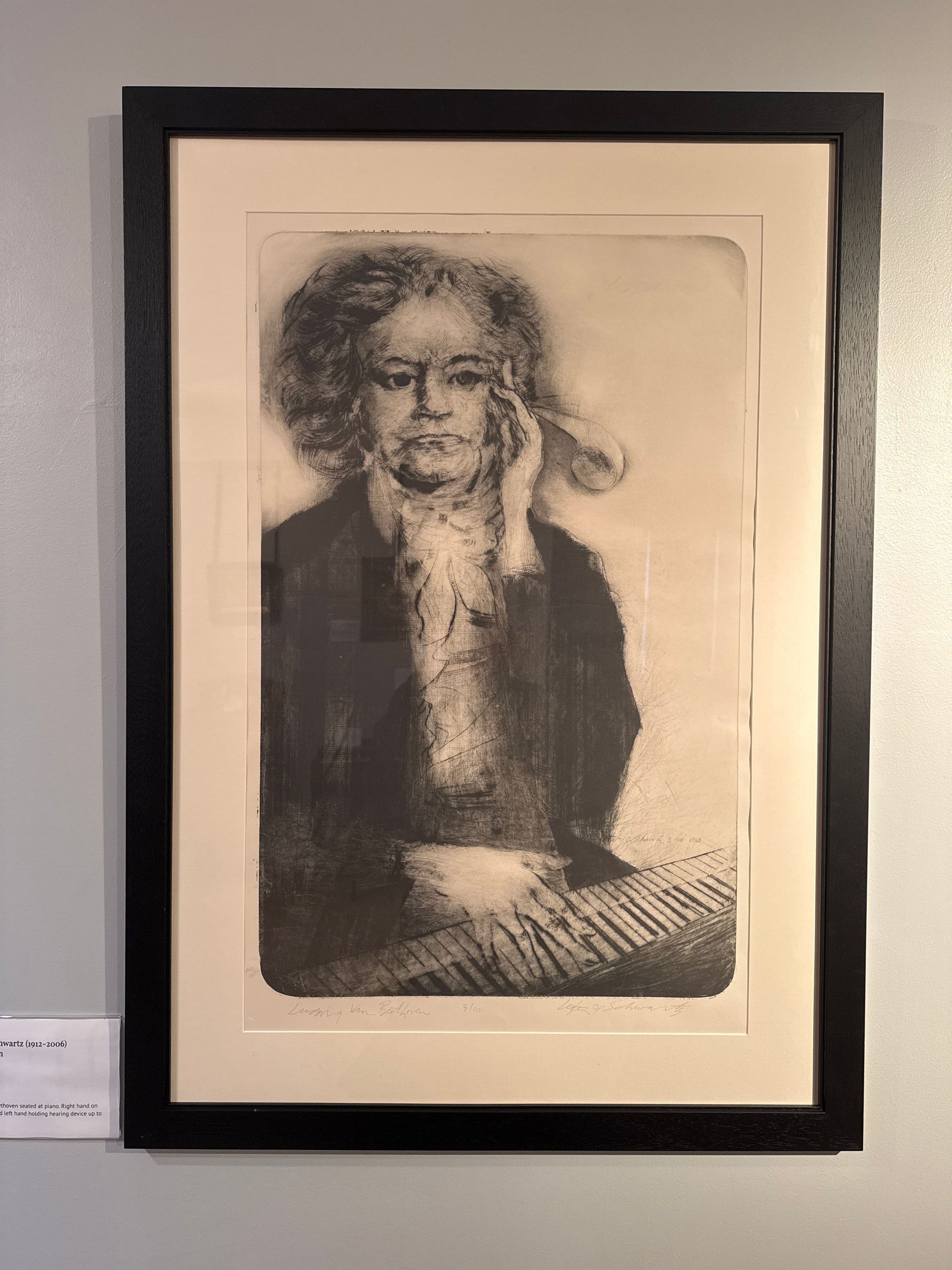 Etching of Beethoven seated at piano. Right hand on piano keys - left hand holding hearing device up to left ear. Signed by Lester Schwartz in 2 positions. Dated 3 VIII 1965 or 1985. Good condition. Shows evidence of loose folds, but not creased. See RHS Archives and Ripon College Archives for further information on Lester Schwartz. Measures 24" x 36 ½".Collection