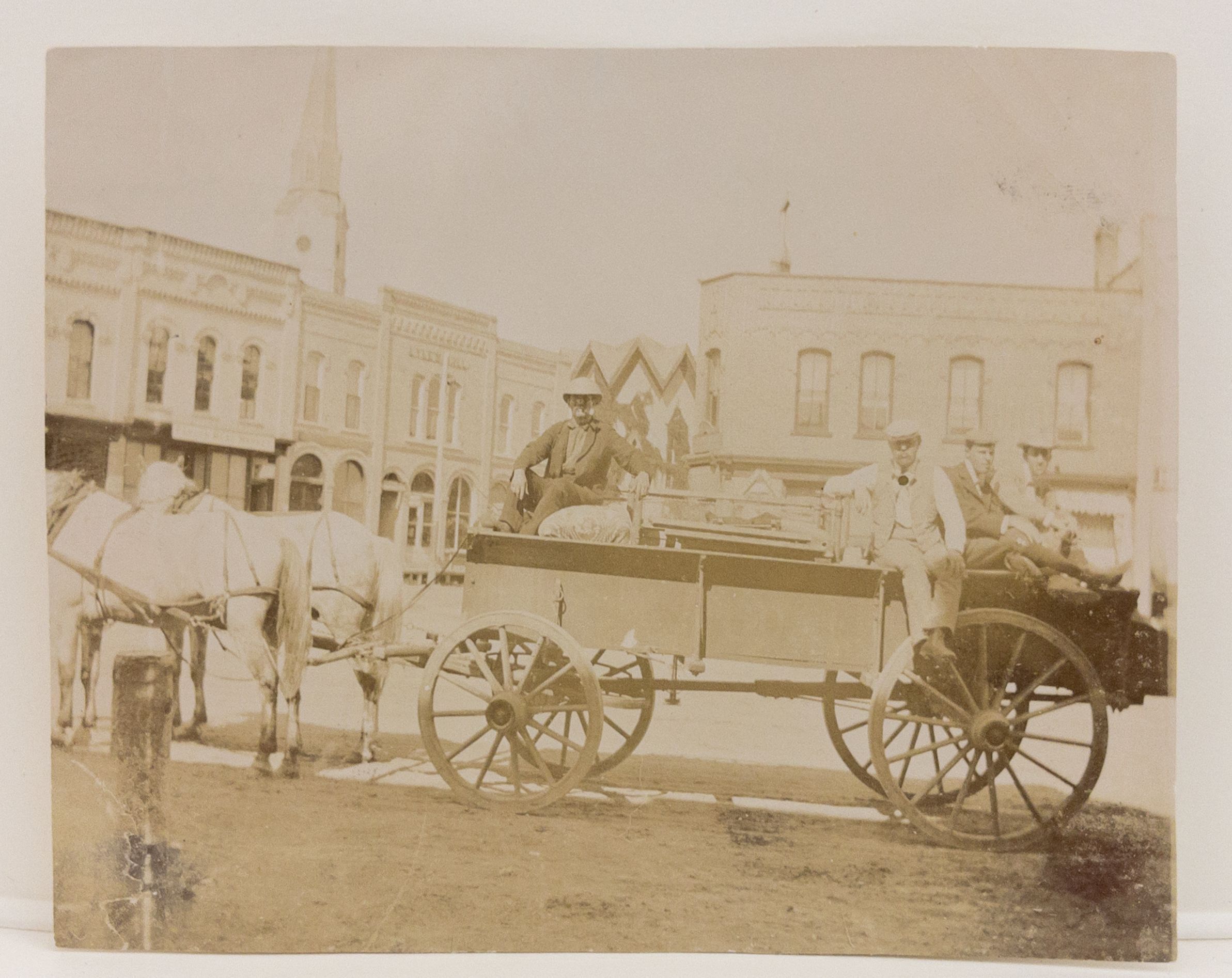 3.5 x 4.5" photo of open wagon pulled by 2 horses. 4 unidentified men. Photo taken in Ripon Public Square. Writing on back says Juyly 24, 1898. P6 36/Vol. 3 - What that refers to is not indicated.. Description of location and buildings written on back. Details of men unknown.Acquisition