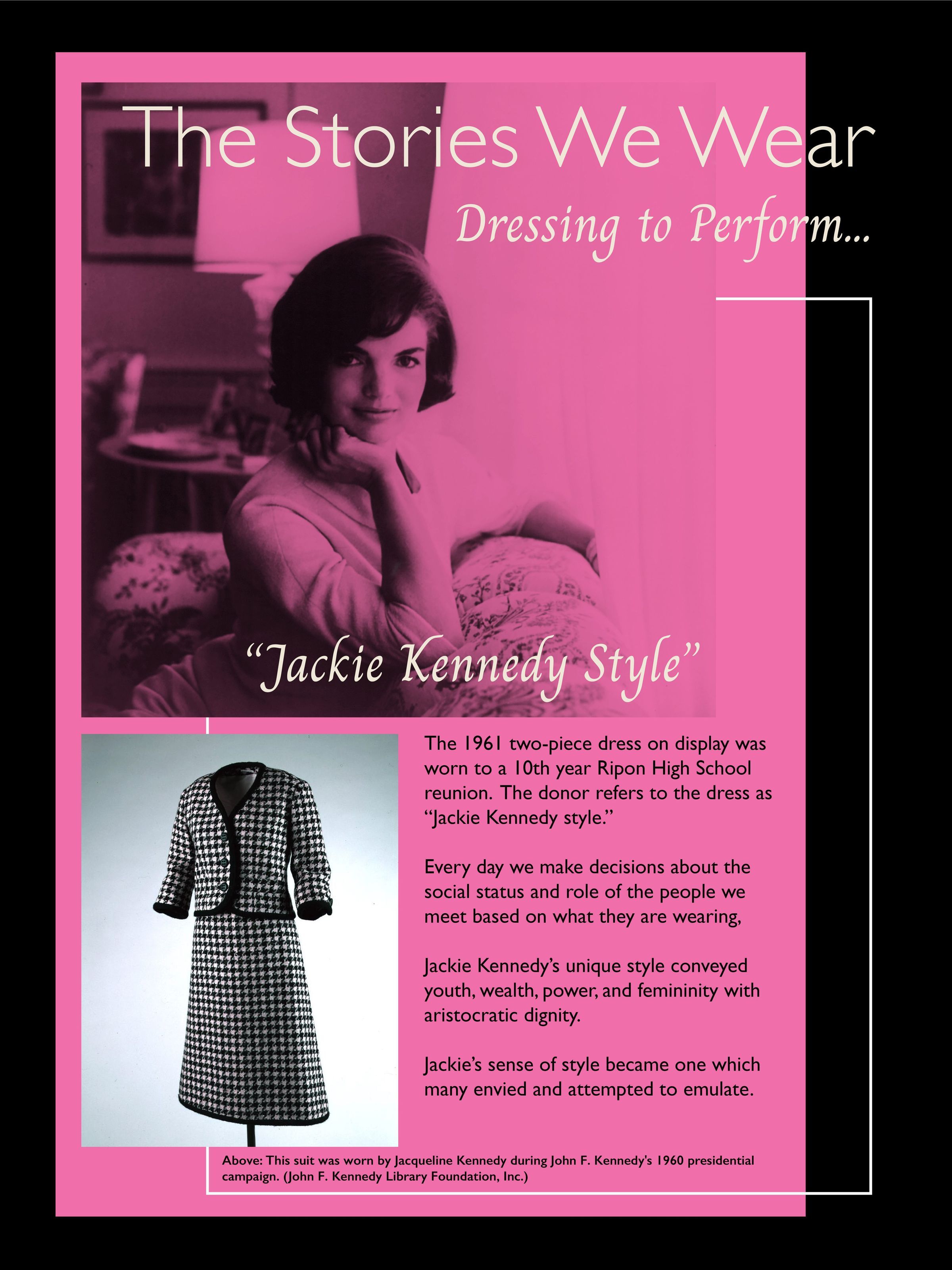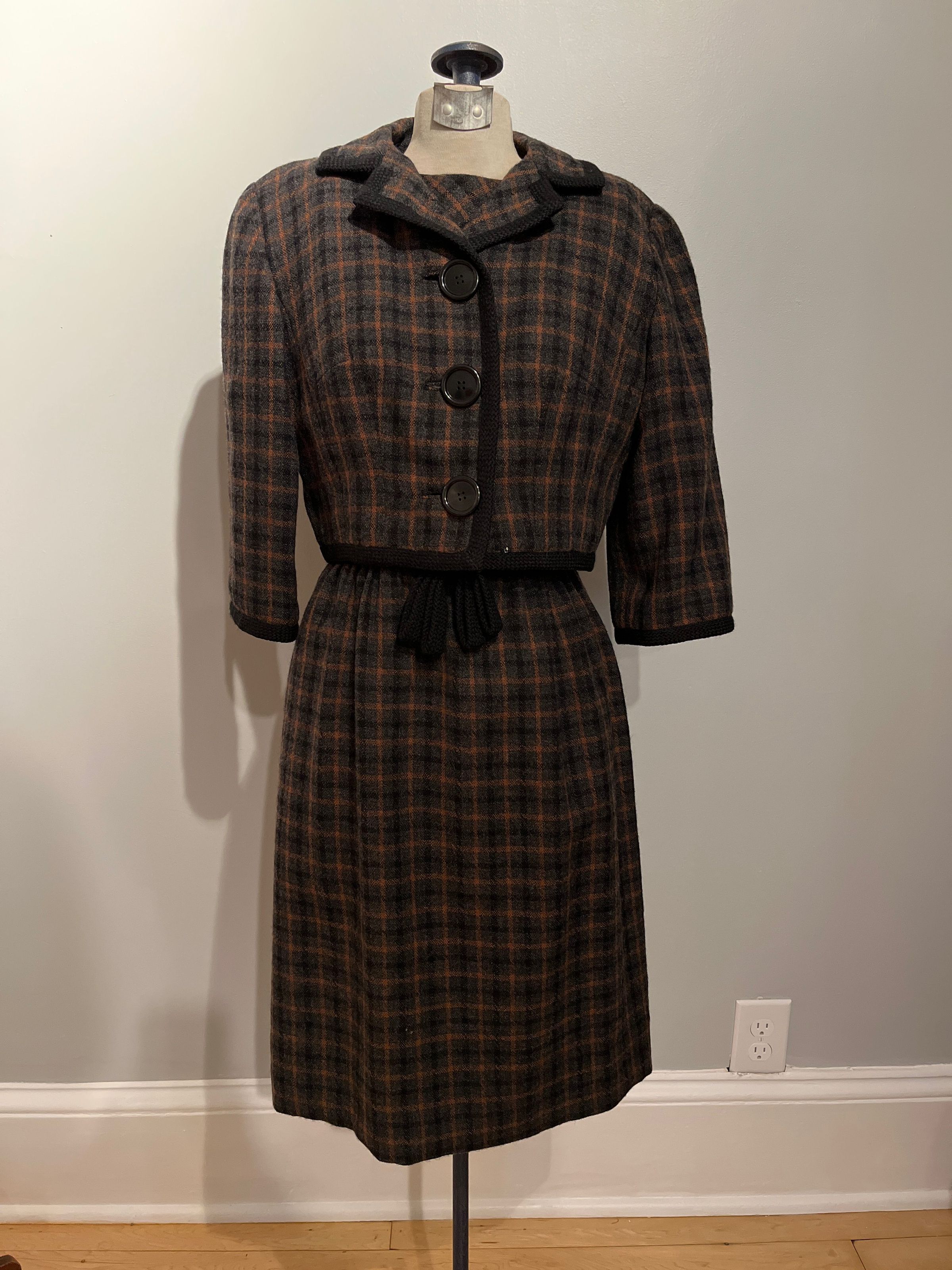 Two piece dress of woven black, grey and tan fabric (probably wool) with black braid outlining collar, front opening and bottom edge of short jacket and its sleeve lower edge. Braid also around waist of dress with braid bow at center front of waist. Dress has short sleeves, no collar and zipper closing on back. Skirt of dress gathered at waist. Jacket closed with three, 3 3/8" plain black buttons. Dress and jacket have black lining. Shows use but intact. Donor refers to dress as "Jackie Kennedy" style. She wore it to her 10th reunion from Ripon High School in 1961. she bought it in Madison, WI. Stored with clothing collection.Collection