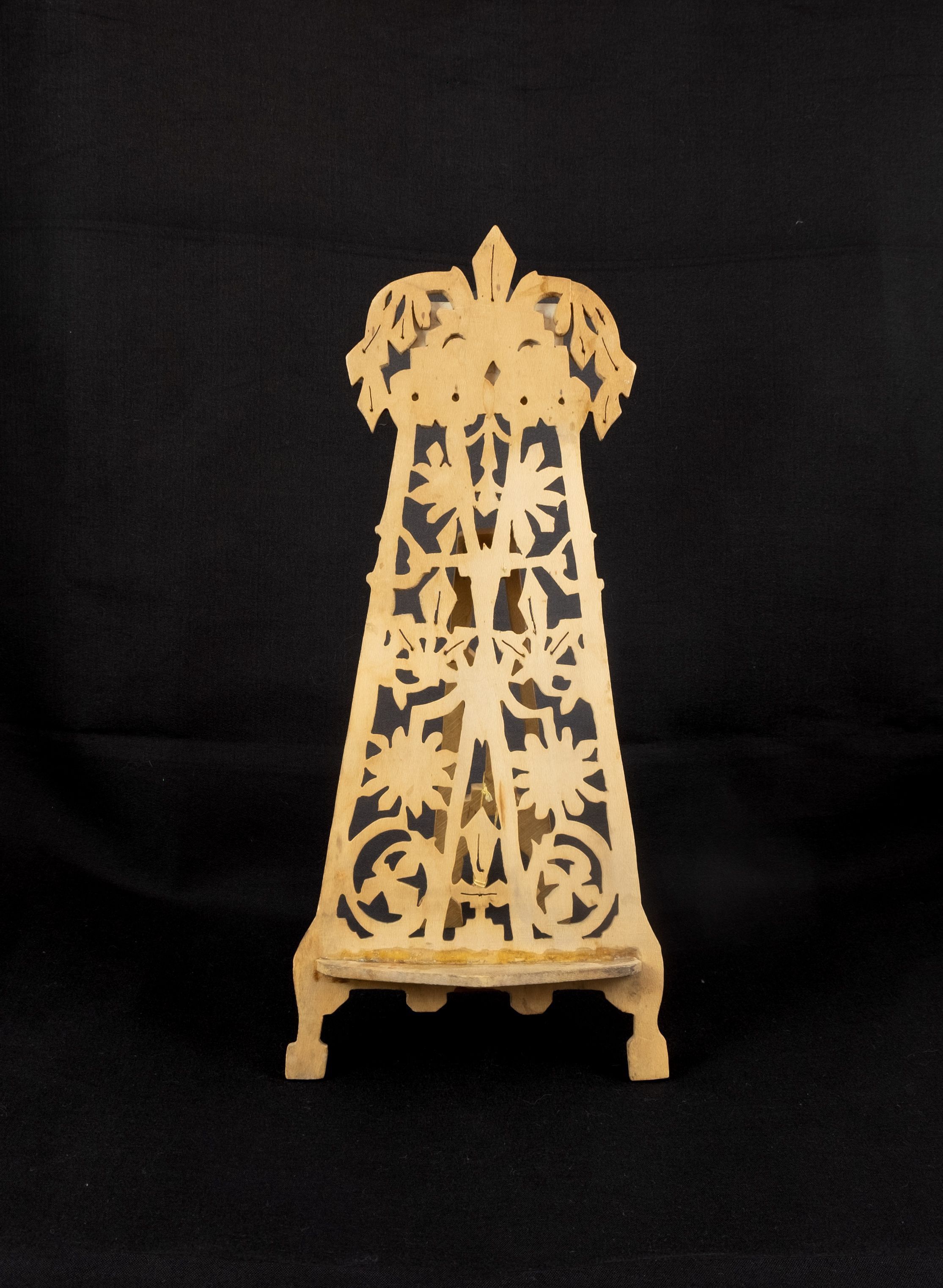 Easel 10" h x 4 3/8"w at base made of cutout wood by Sam Pedrick (B. 1868 d. 1963). A note on the back of easel says it was "hand carved"--"by Samuel Pedrick when he was in high school, about 1880. Natural wood never varnished. Shows use but intact. Probably for use wirh a small picture or photogrpah. History not known.
