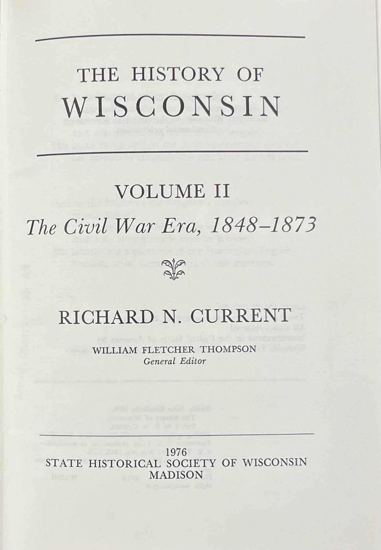 The History of Wisconsin, vol. 2 the Civil War Era, 1848-1873 by Richard N. Current