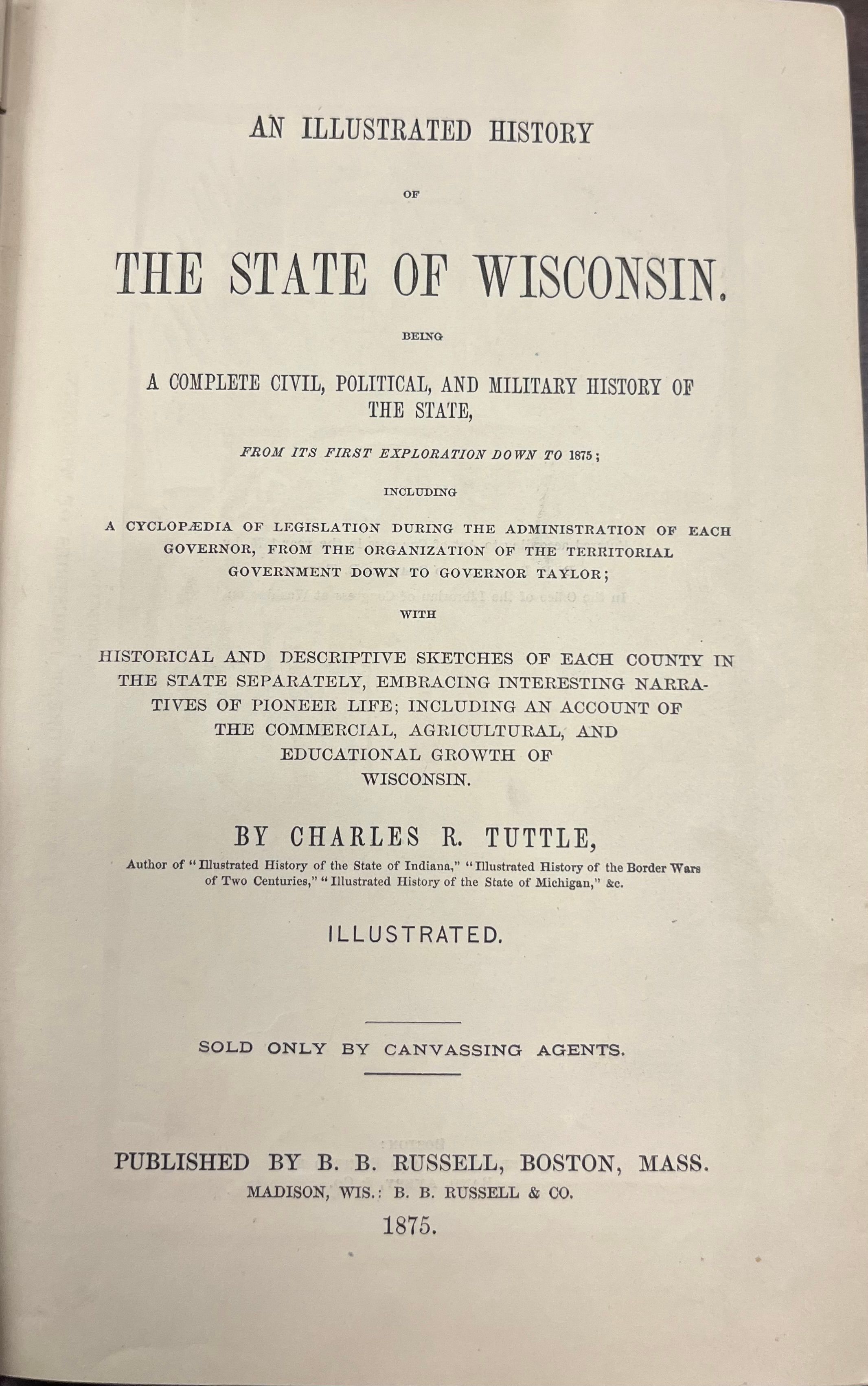 Being a Complete Civil, Political, and Military History of the State, from its First Exploration Down to 1875; Including a Cyclopaedia of Legislation During the Administration of Each Governor, From the Organization of the Territorial Government Down to Governor Taylor; with Historical and Descriptive Sketches of Each County in the State Separately, Embracing interesting Narratives of Pioneer Life; Including an Account of the Commercial, Agricultural, and Educational Growth of Wisconsin.Acquisition