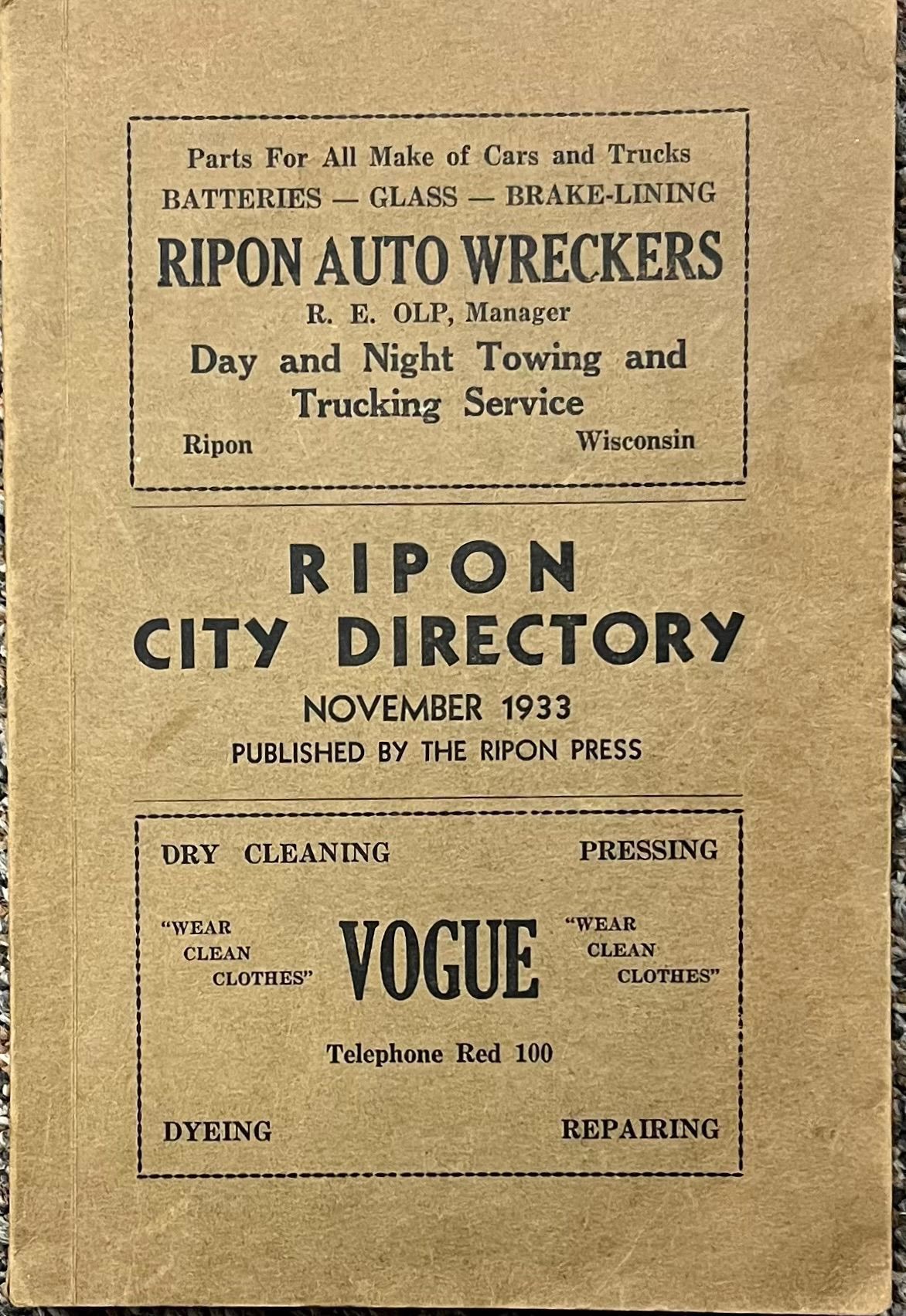 Ripon City Directory November 1933