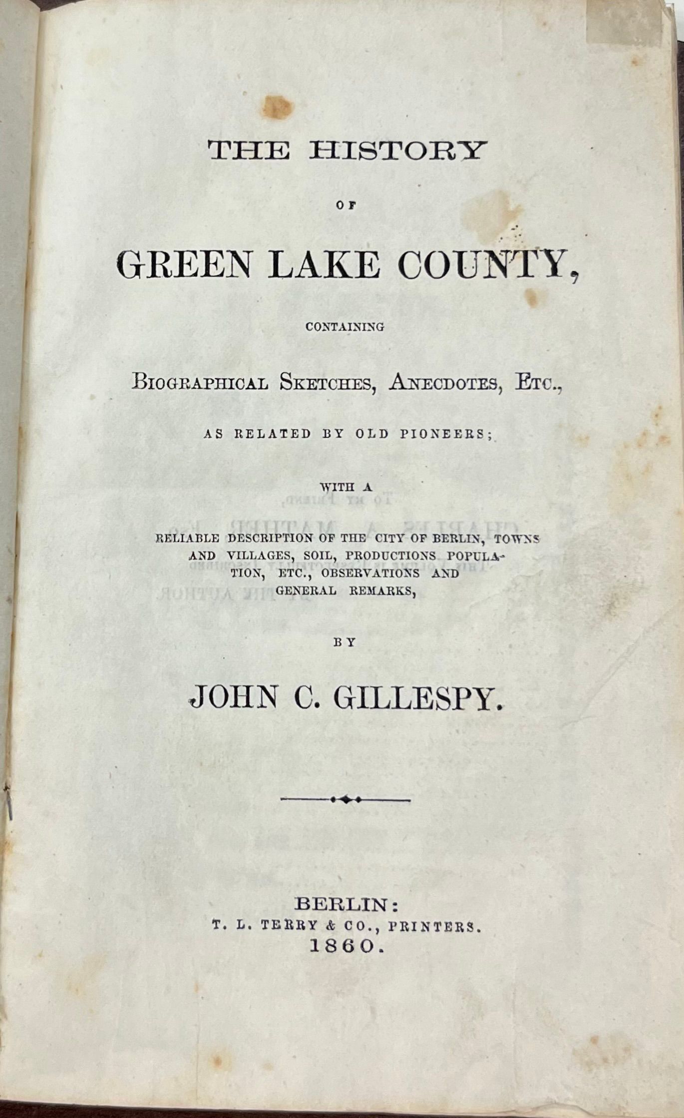The History of Green Lake County, containing biographical sketches, anecdotes, Etc. as related by old pioneers; with a reliable description of the city of Berlin, Town and Villages, soil, productions, population, Etc. observations and general remarks by John C. GillespyAcquisition