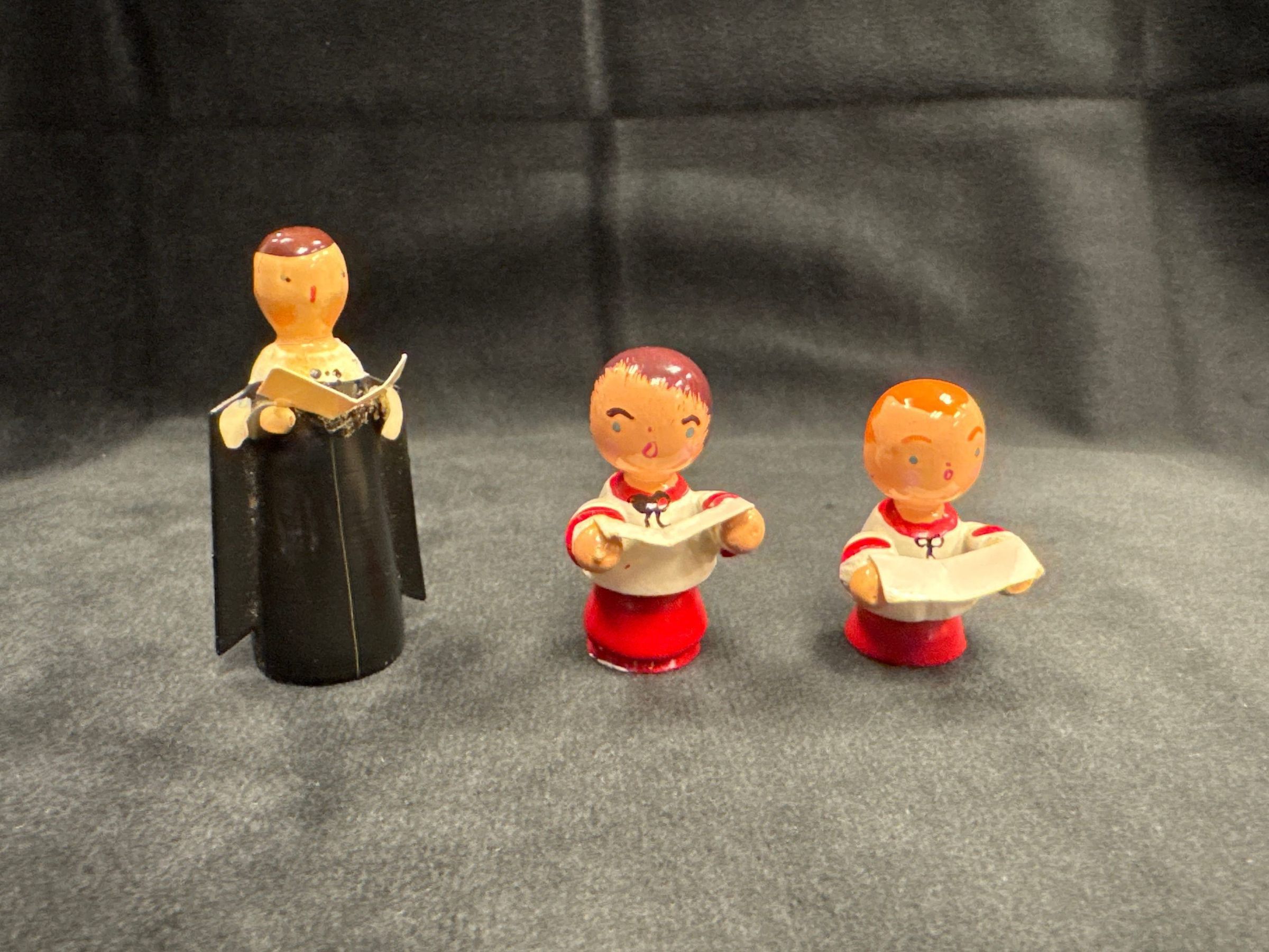 Choir boys: Painted wooden miniatures in red and white choir robes with music in hands - 1 1/2 " high