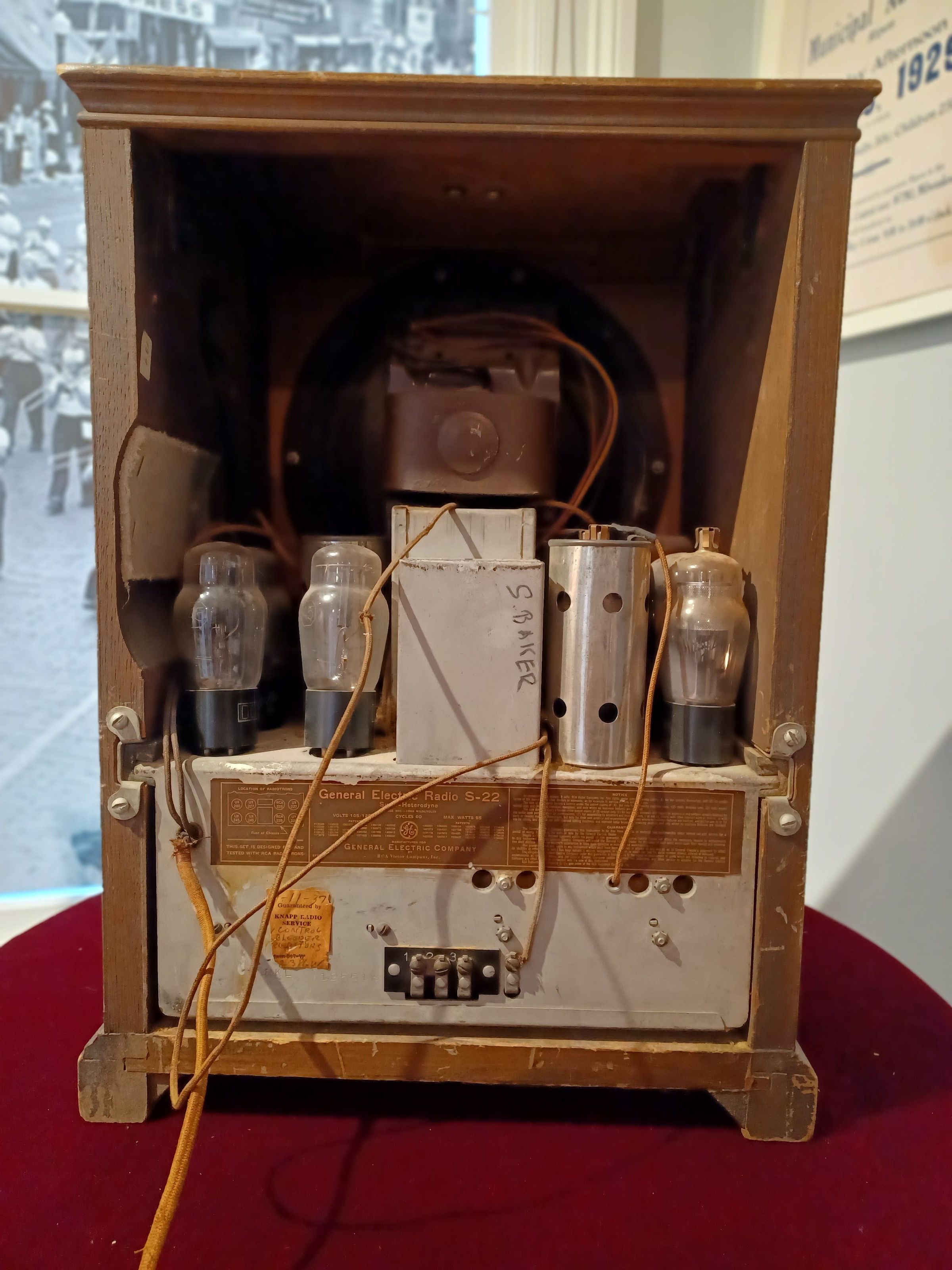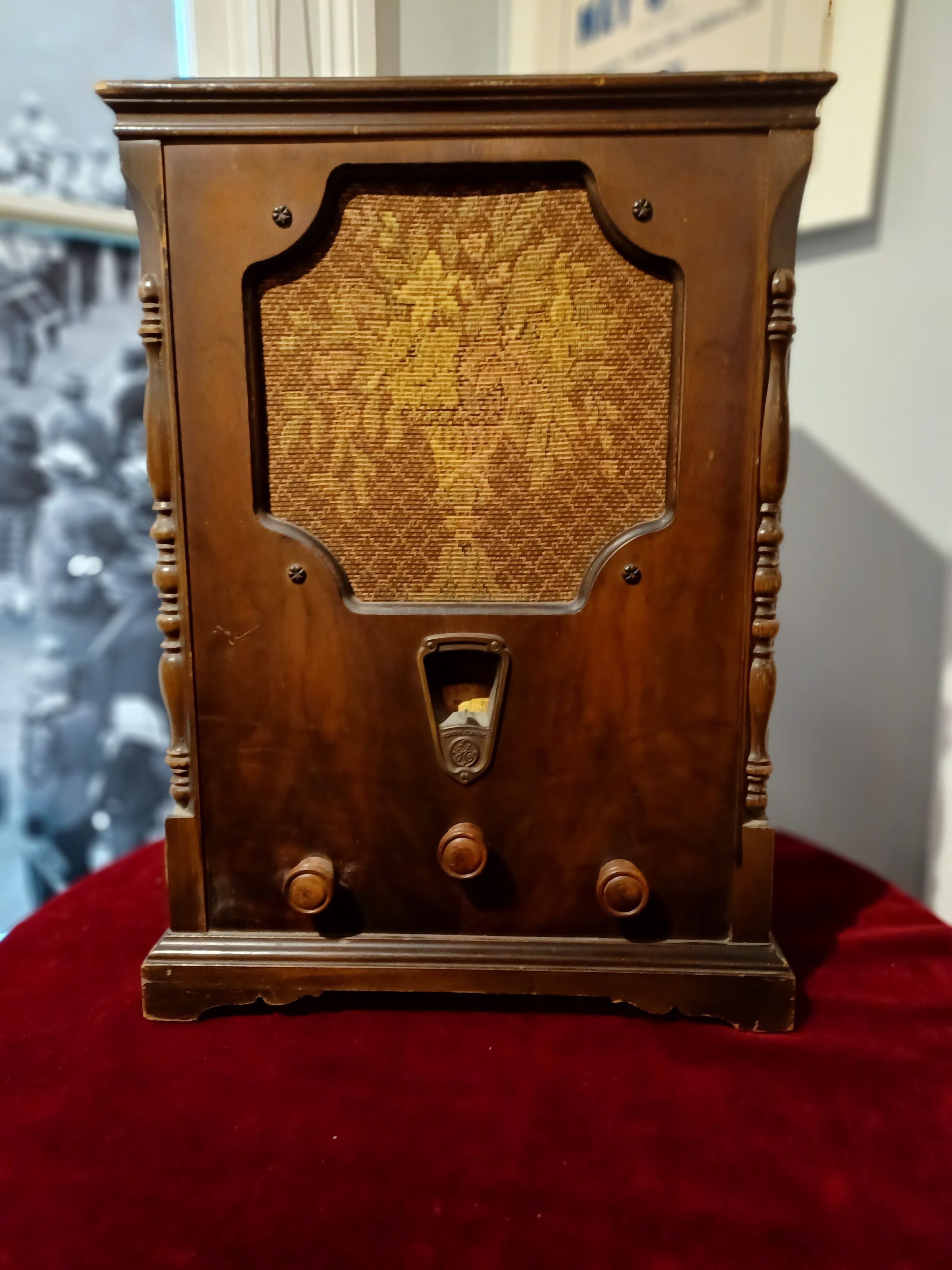 GE S-22 Junior Broadcast Receiver Tombstone Radio; donated by the Zobel Family Wood with bouquet embroidered grille cloth. 13.8 x 19.7 x 10.2 inches; about 37 lb Date on the back says 4/11/37