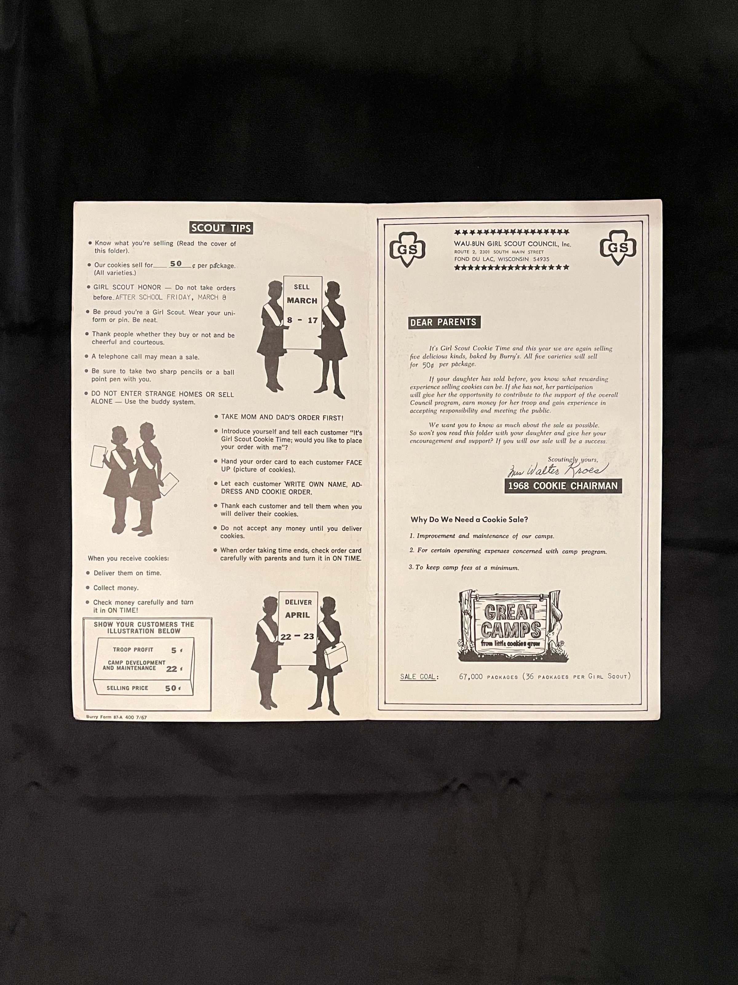 Girl Scout cookie folder, listing types of cookies, sales instructions for scouts, and an order log on the back. c. 1967Context
